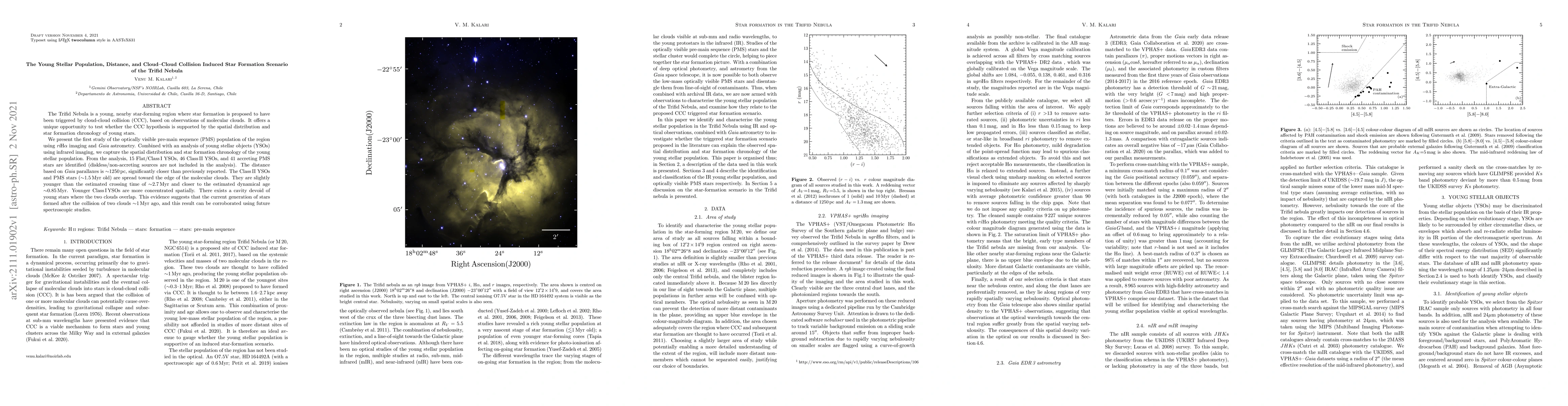 The Trifid Nebula's young stellar population, analyzed using Gaia astrometry and infrared imaging, supports a cloud-cloud collision-induced star formation scenario. The distance is revised to approximately 1250 pc, and the spatial distribution indicates star formation triggered by the collision about 1 Myr ago.