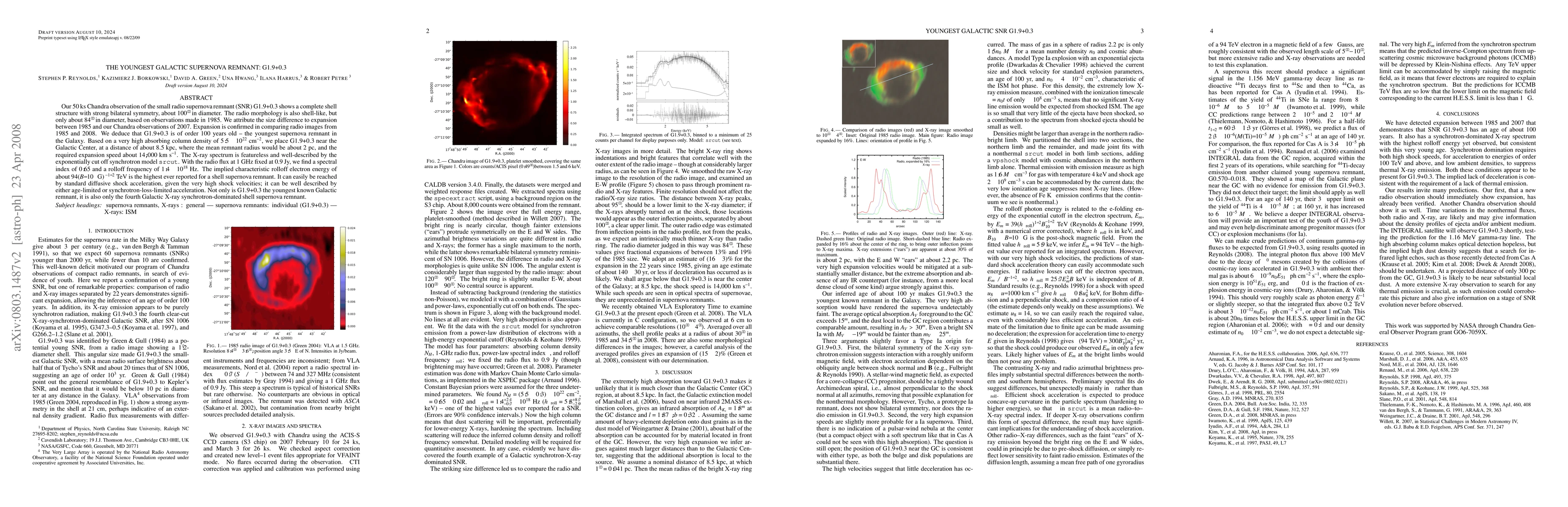 G1.9+0.3 is the youngest known Galactic supernova remnant, estimated to be around 100 years old, based on Chandra and radio observations showing expansion since 1985. Its high absorbing column density places it near the Galactic Center, characterized by a high rolloff electron energy of about 94 TeV.