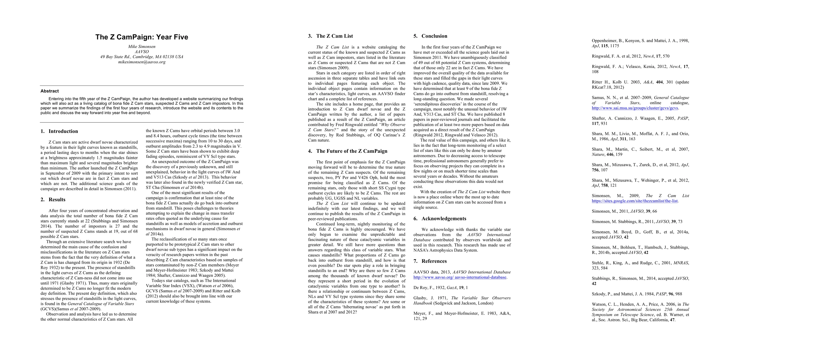 Entering into the fifth year of the Z CamPaign, the author has developed a website summarizing our findings which will also act as a living catalog of bona fide Z Cam stars, suspected Z Cams and Z Cam impostors. In this paper we summarize the findings of the first four years of research, introduce the website and its contents to the public and discuss the way forward into year five and beyond.