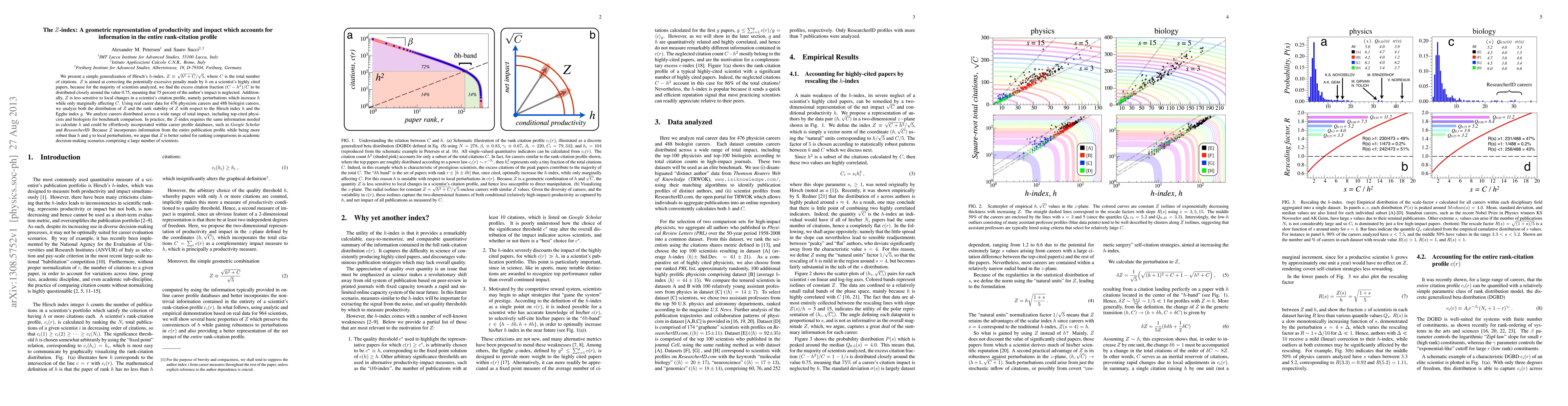 We present a simple generalization of Hirsch's h-index, Z = \sqrt{h^{2}+C}/\sqrt{5}, where C is the total number of citations. Z is aimed at correcting the potentially excessive penalty made by h on a scientist's highly cited papers, because for the majority of scientists analyzed, we find the excess citation fraction (C-h^{2})/C to be distributed closely around the value 0.75, meaning that 75 percent of the author's impact is neglected. Additionally, Z is less sensitive to local changes in a scientist's citation profile, namely perturbations which increase h while only marginally affecting C. Using real career data for 476 physicists careers and 488 biologist careers, we analyze both the distribution of $Z$ and the rank stability of Z with respect to the Hirsch index h and the Egghe index g. We analyze careers distributed across a wide range of total impact, including top-cited physicists and biologists for benchmark comparison. In practice, the Z-index requires the same information needed to calculate h and could be effortlessly incorporated within career profile databases, such as Google Scholar and ResearcherID. Because Z incorporates information from the entire publication profile while being more robust than h and g to local perturbations, we argue that Z is better suited for ranking comparisons in academic decision-making scenarios comprising a large number of scientists.
