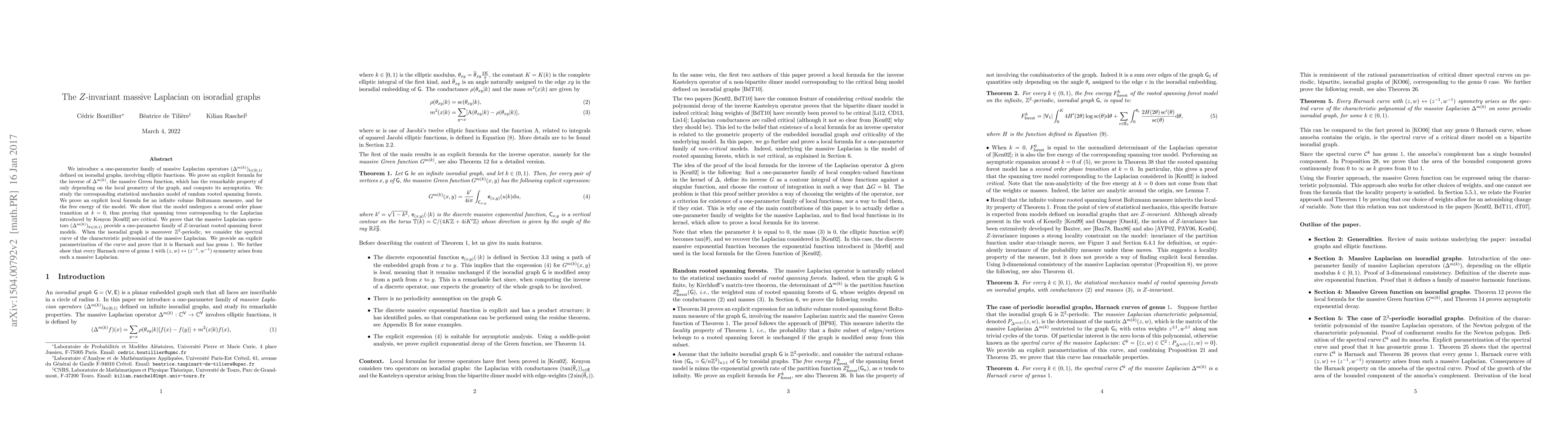 This paper introduces a family of massive Laplacian operators on isoradial graphs and derives explicit formulas for their inverses. It studies a statistical mechanics model related to random rooted spanning forests, proving a phase transition and characterizing the spectral curve of the characteristic polynomial for periodic graphs.