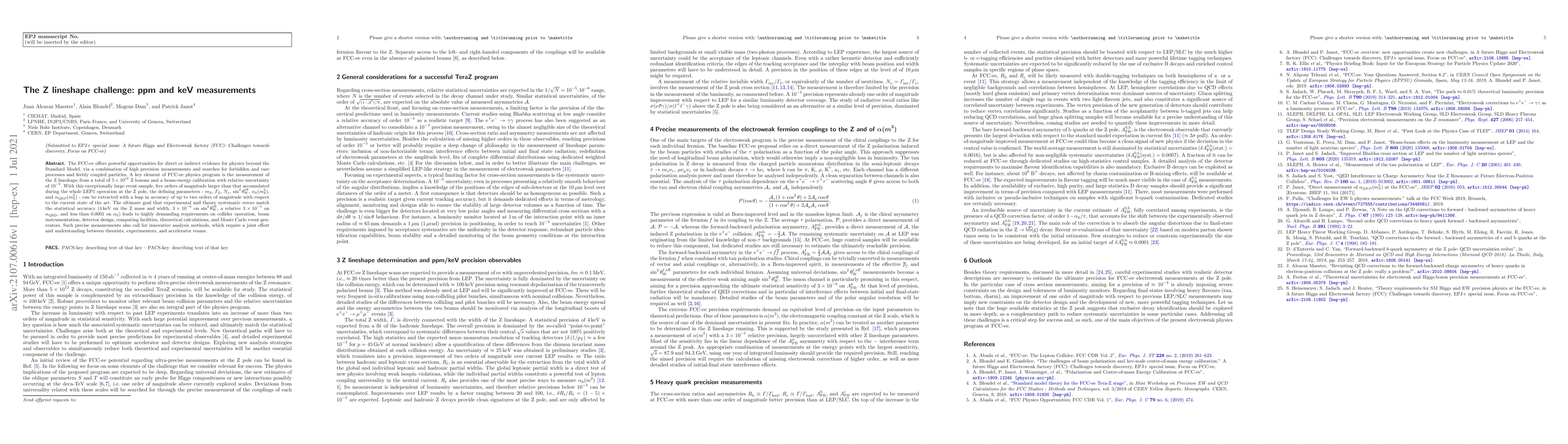The FCC-ee offers powerful opportunities for direct or indirect evidence for physics beyond the Standard Model, via a combination of high precision measurements and searches for forbidden and rare processes and feebly coupled particles. A key element of FCC-ee physics program is the measurement of the Z lineshape from a total of $5\times 10^{12}$ Z bosons and a beam-energy calibration with relative uncertainty of $10^{-6}$. With this exceptionally large event sample, five orders of magnitude larger than that accumulated during the whole LEP1 operation at the Z pole, the defining parameters - $m_{\rm Z}$, $\Gamma_{\rm Z}$, $N_\nu$, $\sin^2\theta_{\rm W}^{\rm eff}$, $\alpha_{\rm S}(m_{\rm Z}^2)$, and $\alpha_{\rm QED}(m^2_{\rm Z})$ - can be extracted with a leap in accuracy of up to two orders of magnitude with respect to the current state of the art. The ultimate goal that experimental and theory systematic errors match the statistical accuracy (4\,keV on the Z mass and width, $3\times 10^{-6}$ on $\sin^2\theta_{\rm W}^{\rm eff}$, a relative $3\times 10^{-5}$ on $\alpha_{\rm QED}$, and less than 0.0001 on $\alpha_{\rm S}$) leads to highly demanding requirements on collider operation, beam instrumentation, detector design, computing facilities, theoretical calculations, and Monte Carlo event generators. Such precise measurements also call for innovative analysis methods, which require a joint effort and understanding between theorists, experimenters, and accelerator teams.