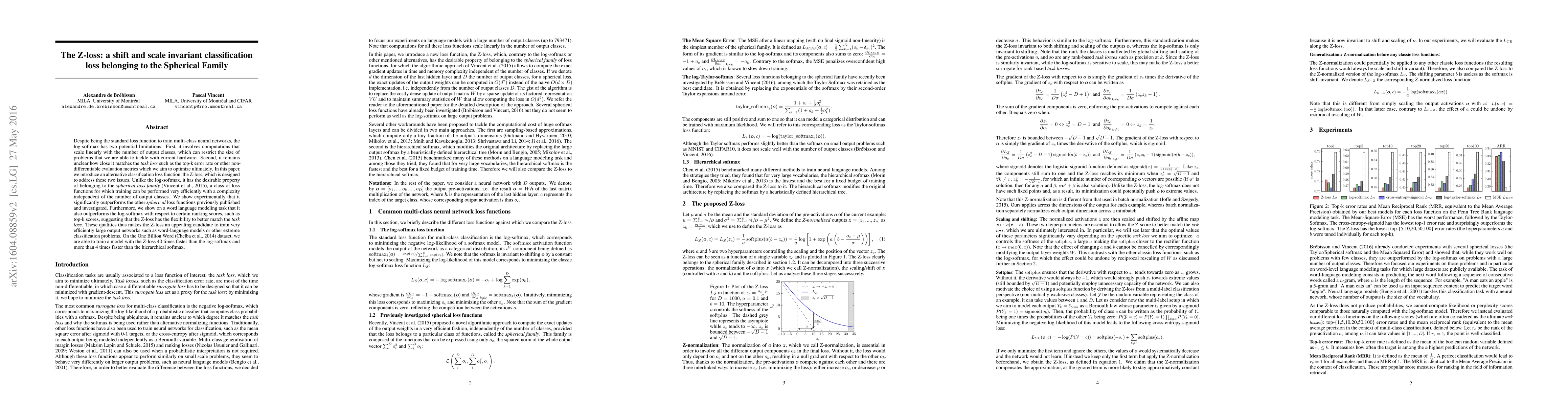 This paper introduces the Z-loss, a new classification loss function designed to address the scalability issues of the log-softmax loss. It belongs to the spherical loss family, enabling efficient training regardless of the number of output classes, and outperforms other spherical loss functions and the log-softmax in terms of both efficiency and task-specific metrics.