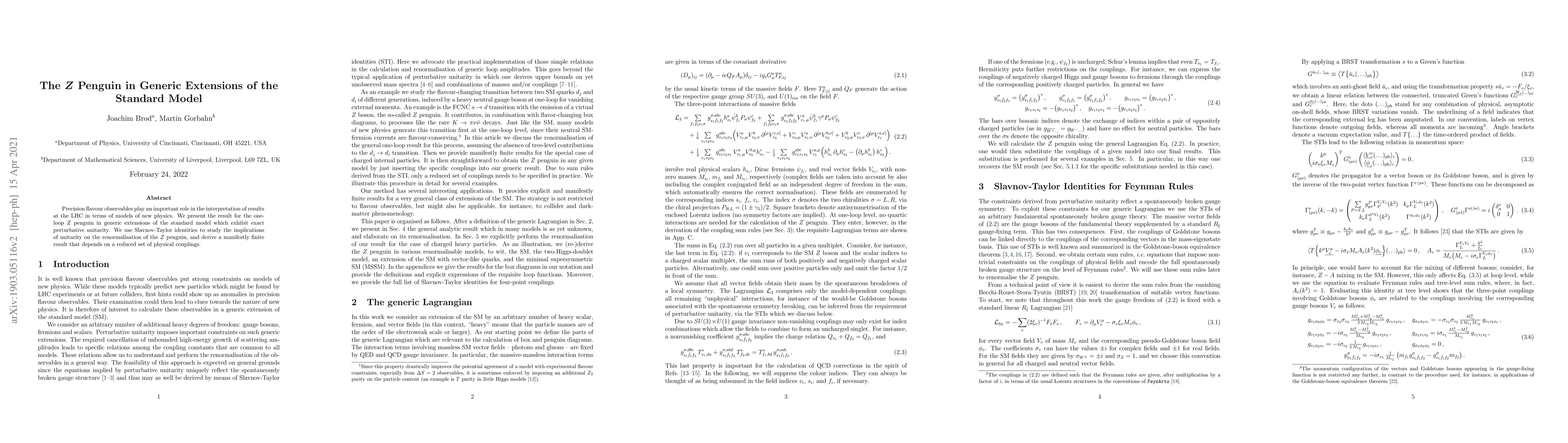 Researchers studied the Z penguin in generic extensions of the Standard Model with exact perturbative unitarity, using Slavnov-Taylor identities to derive a manifestly finite result that depends on reduced physical couplings.
