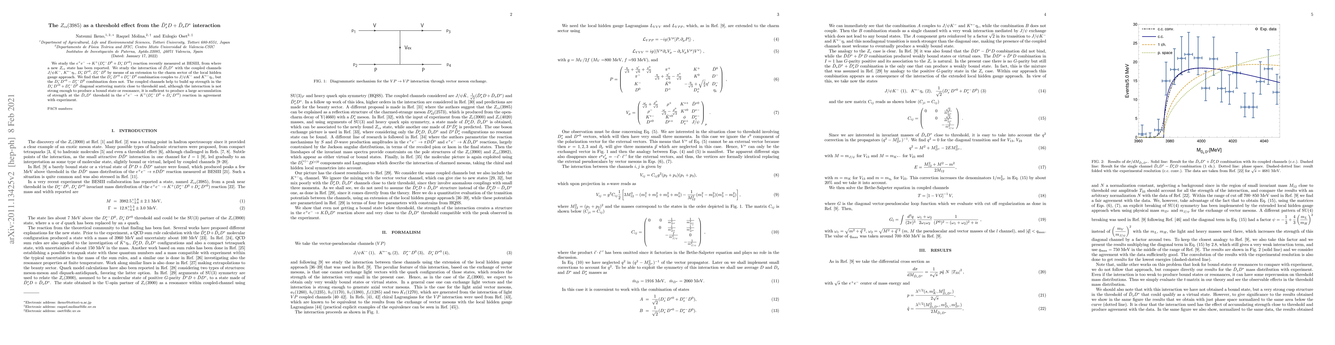 This paper investigates the $e^+ e^- \to K^+ ( D_s^{*-} D^0 + D_s^- D^{*0})$ reaction, attributing the observed $Z_{cs}(3985)$ state to a threshold effect from the $\bar D_s D^*$ interaction in the charm sector, using an extended local hidden gauge approach. The study finds that coupled channels significantly enhance the strength near the threshold, explaining the experimental observation without forming a bound state or resonance.