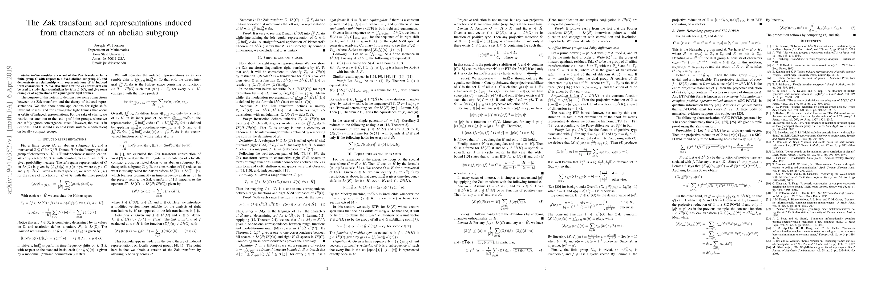 We consider a variant of the Zak transform for a finite group $G$ with respect to a fixed abelian subgroup $H$, and demonstrate a relationship with representations of $G$ induced from characters of $H$. We also show how the Zak transform can be used to study right translations by $H$ in $L^2(G)$, and give some examples of applications for equiangular tight frames.