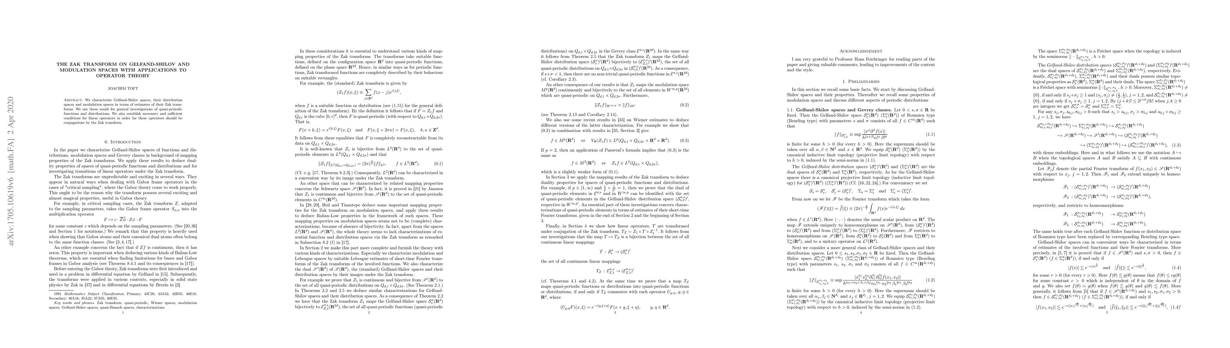 Summary: This paper characterizes Gelfand-Shilov, distribution, and modulation spaces via Zak transform estimates, applying these insights to quasi-periodic functions and operator theory, and establishes conditions for operators to be conjugations by the Zak transform.