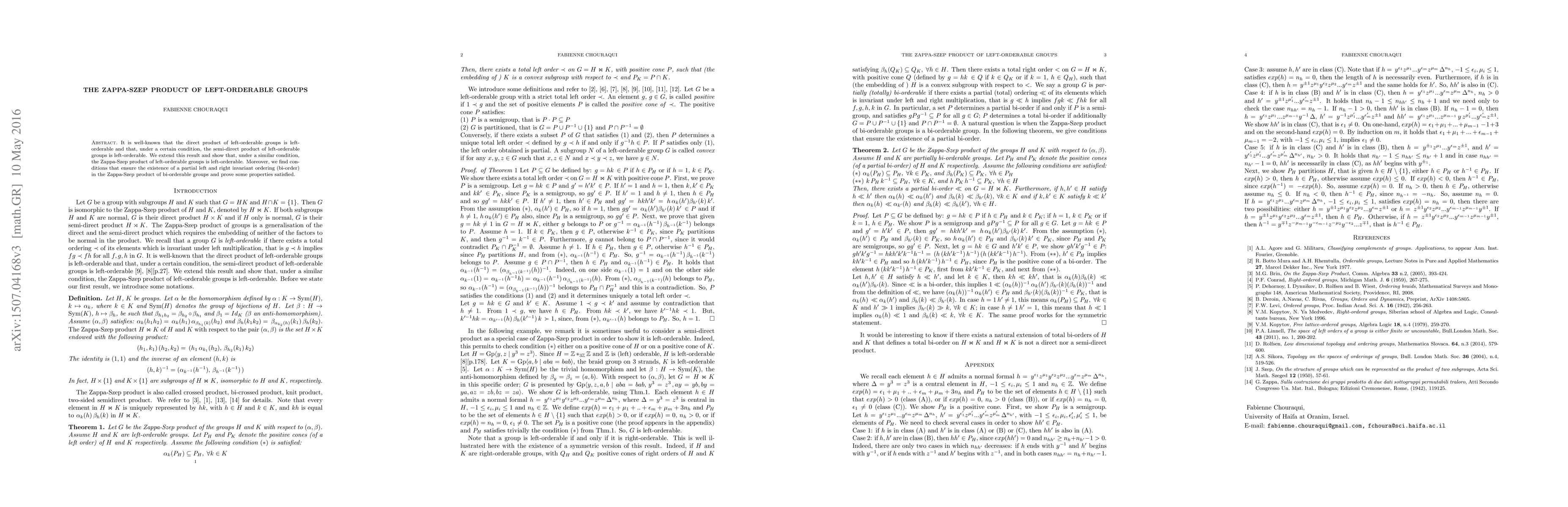 This paper demonstrates that the Zappa-Szep product of left-orderable groups remains left-orderable under specific conditions, extending the known results for direct and semi-direct products. It also investigates conditions for the existence of a bi-order in the Zappa-Szep product of bi-orderable groups and proves associated properties.