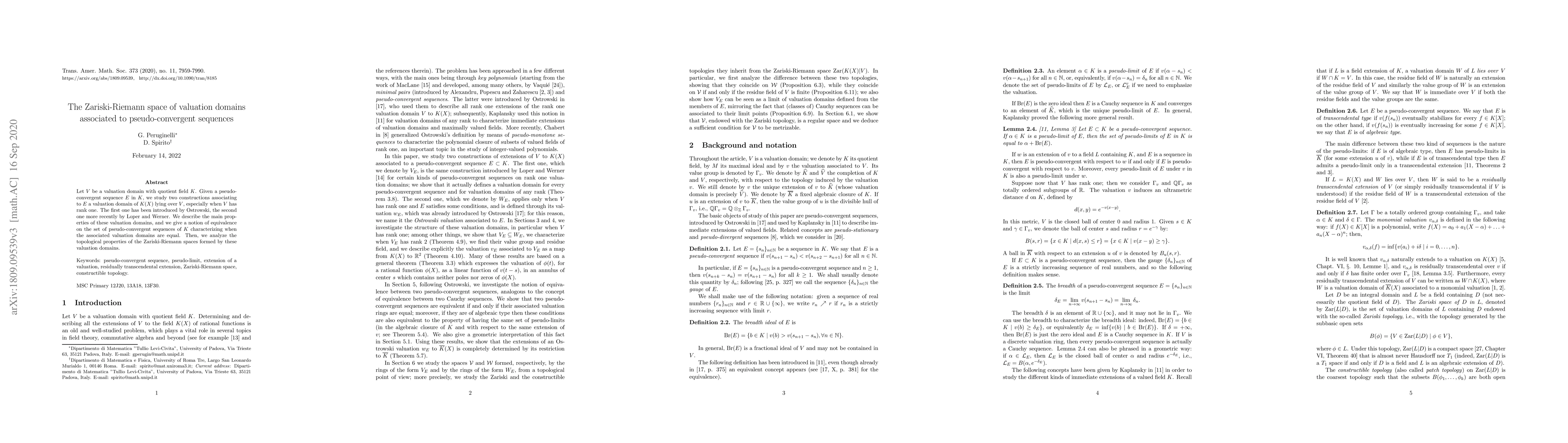 Let $V$ be a valuation domain with quotient field $K$. Given a pseudo-convergent sequence $E$ in $K$, we study two constructions associating to $E$ a valuation domain of $K(X)$ lying over $V$, especially when $V$ has rank one. The first one has been introduced by Ostrowski, the second one more recently by Loper and Werner. We describe the main properties of these valuation domains, and we give a notion of equivalence on the set of pseudo-convergent sequences of $K$ characterizing when the associated valuation domains are equal. Then, we analyze the topological properties of the Zariski-Riemann spaces formed by these valuation domains.