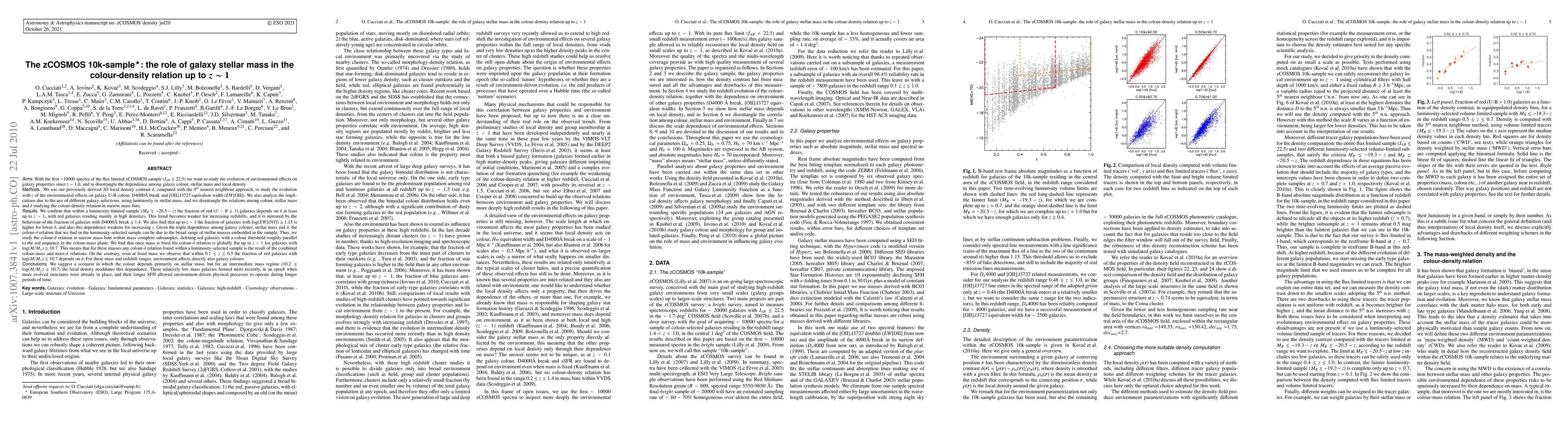 The zCOSMOS 10k-sample study reveals that galaxy colour-density relations are influenced by stellar mass and local density, with red galaxies predominantly found in high-density regions up to z=1. For galaxies with high stellar mass (log(M/M_sun)>=10.7), the colour-density relation is flat due to the combined colour-mass and mass-density effects.