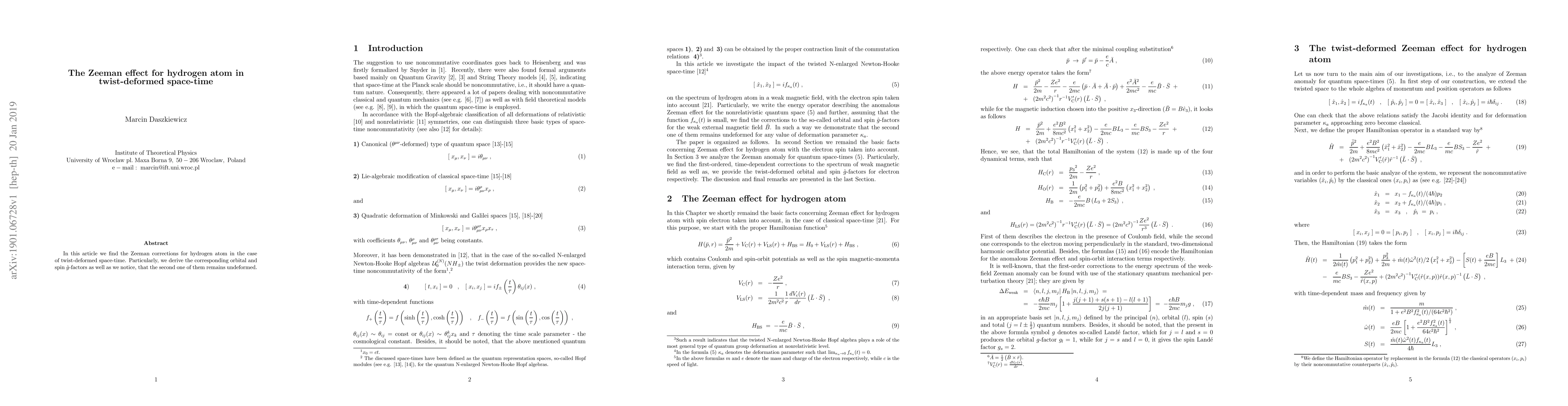 Researchers found Zeeman corrections for a hydrogen atom in twisted space-time, specifically that the spin g-factor remains undeformed.