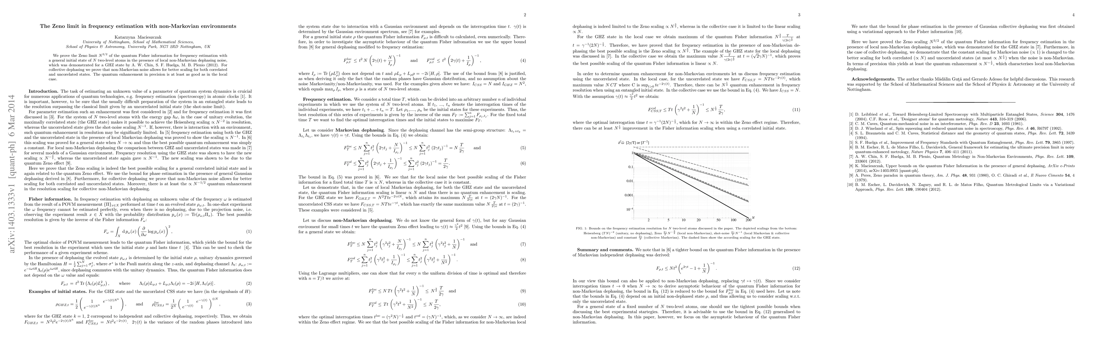 We prove the Zeno limit $N^{3/2}$ of the quantum Fisher information for frequency estimation with a general initial state of $N$ two-level atoms in the presence of local non-Markovian dephasing noise, which was demonstrated for a GHZ state by A. W. Chin, S. F. Huelga, M. B. Plenio (2012). For collective dephasing we prove that non-Markovian noise allows for better scaling for both correlated and uncorelated states. The quantum enhancement in precision is at least as good as in the local case.