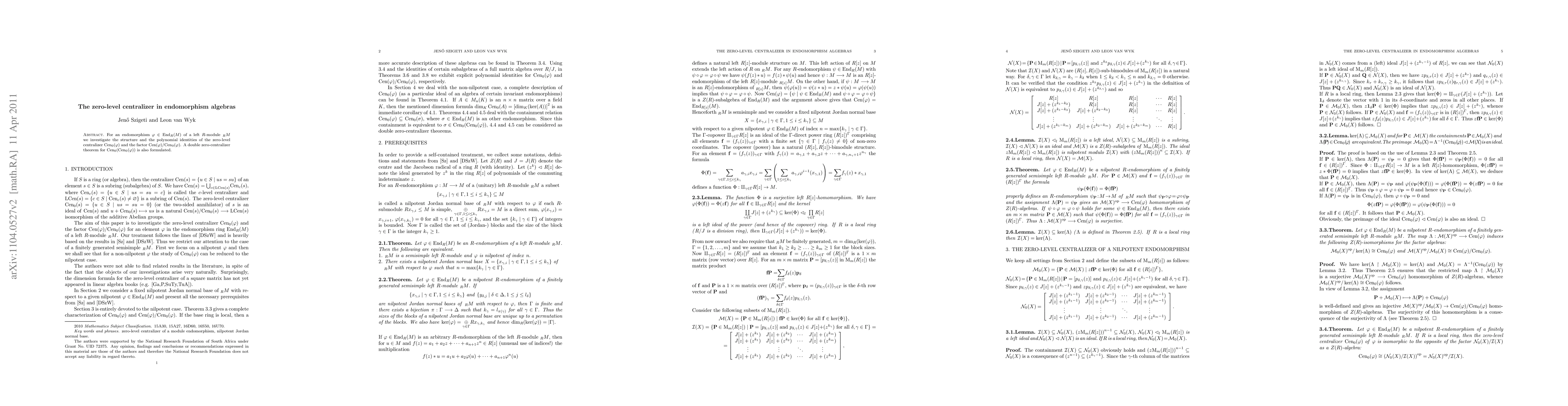 For an endomorphism f\inEnd{M) of a left R-module M we investigate the structure and the polynomial identities of the zero-level centralizer Cen_0(f) and the factor Cen(f)/Cen_0(f). A double zero-centralizer theorem for Cen_0(Cen_0(f)) is also formulated.
