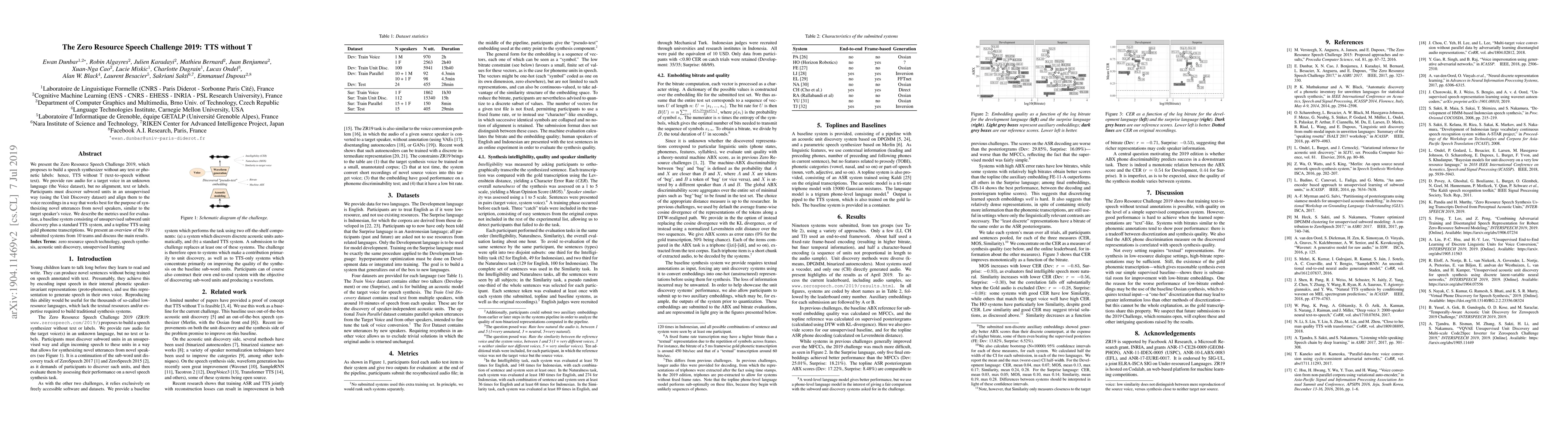We present the Zero Resource Speech Challenge 2019, which proposes to build a speech synthesizer without any text or phonetic labels: hence, TTS without T (text-to-speech without text). We provide raw audio for a target voice in an unknown language (the Voice dataset), but no alignment, text or labels. Participants must discover subword units in an unsupervised way (using the Unit Discovery dataset) and align them to the voice recordings in a way that works best for the purpose of synthesizing novel utterances from novel speakers, similar to the target speaker's voice. We describe the metrics used for evaluation, a baseline system consisting of unsupervised subword unit discovery plus a standard TTS system, and a topline TTS using gold phoneme transcriptions. We present an overview of the 19 submitted systems from 10 teams and discuss the main results.