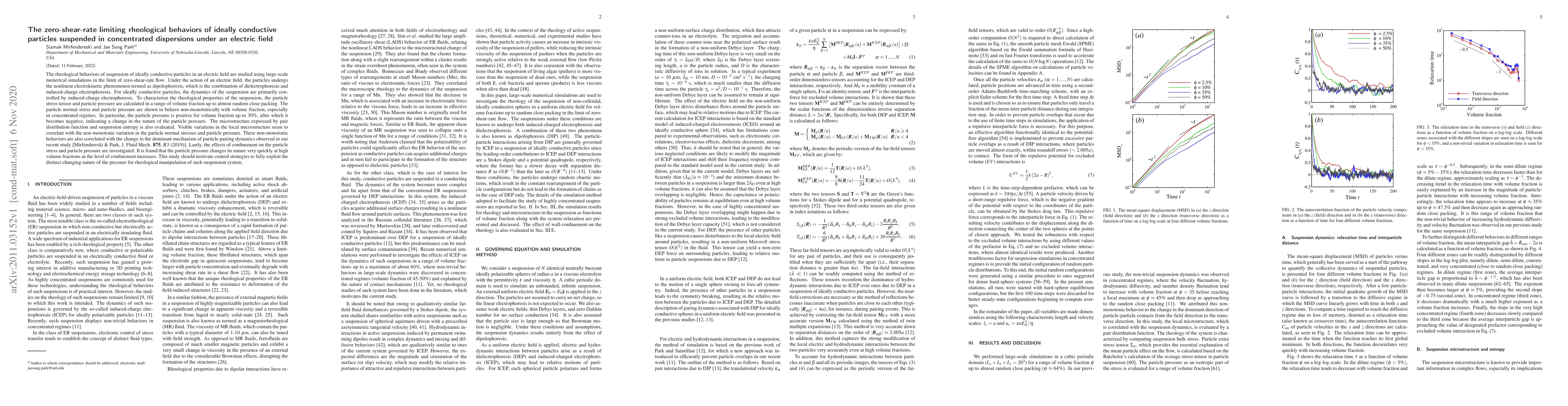 The rheological behaviors of suspension of ideally conductive particles in an electric field are studied using large-scale numerical simulations in the limit of zero-shear-rate flow. Under the action of an electric field, the particles undergo the nonlinear electrokinetic phenomenon termed as dipolophoresis, which is the combination of dielectrophoresis and induced-charge electrophoresis. For ideally conductive particles, the dynamics of the suspension are primarily controlled by induced-charge electrophoresis. To characterize the rheological properties of the suspension, the particle stress tensor and particle pressure are calculated in a range of volume fraction up to almost random close packing. The particle normal stress and particle pressure are shown to behave non-monotonically with volume fraction, especially in concentrated regimes. In particular, the particle pressure is positive for volume fraction up to 30\%, after which it becomes negative, indicating a change in the nature of the particle pressure. The microstructure expressed by pair distribution function and suspension entropy is also evaluated. Visible variations in the local microstructure seem to correlate with the non-monotonic variation in the particle normal stresses and particle pressure. These non-monotonic behaviors are also correlated with the change in the dominant mechanism of particle pairing dynamics observed in our recent study [Mirfendereski \& Park, J. Fluid Mech. \textbf{875}, R3 (2019)]. Lastly, the effects of confinement on the particle stress and particle pressure are investigated. It is found that the particle pressure changes its nature very quickly at high volume fractions as the level of confinement increases. This study should motivate control strategies to fully exploit the distinct changing nature of the pressure for rheological manipulation of such suspension system.