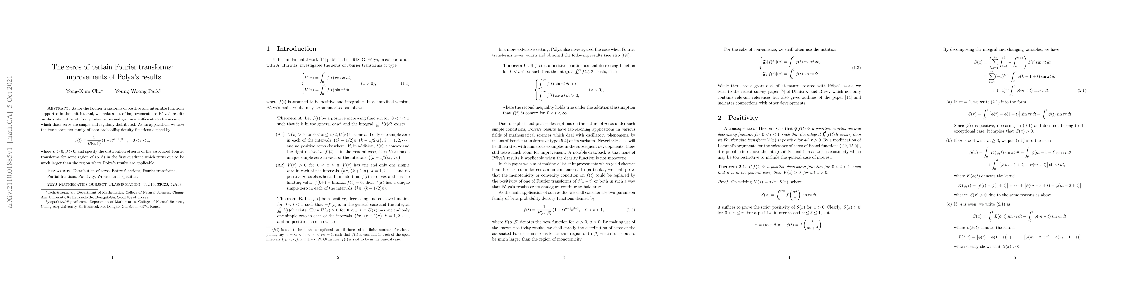 This paper improves Pólya's results on the distribution of positive zeros for Fourier transforms of integrable functions on the unit interval, providing new conditions for simple and regular zero distribution. It applies these findings to beta probability density functions, extending the region in the first quadrant where the zeros are distributed beyond Pólya's original applicability.