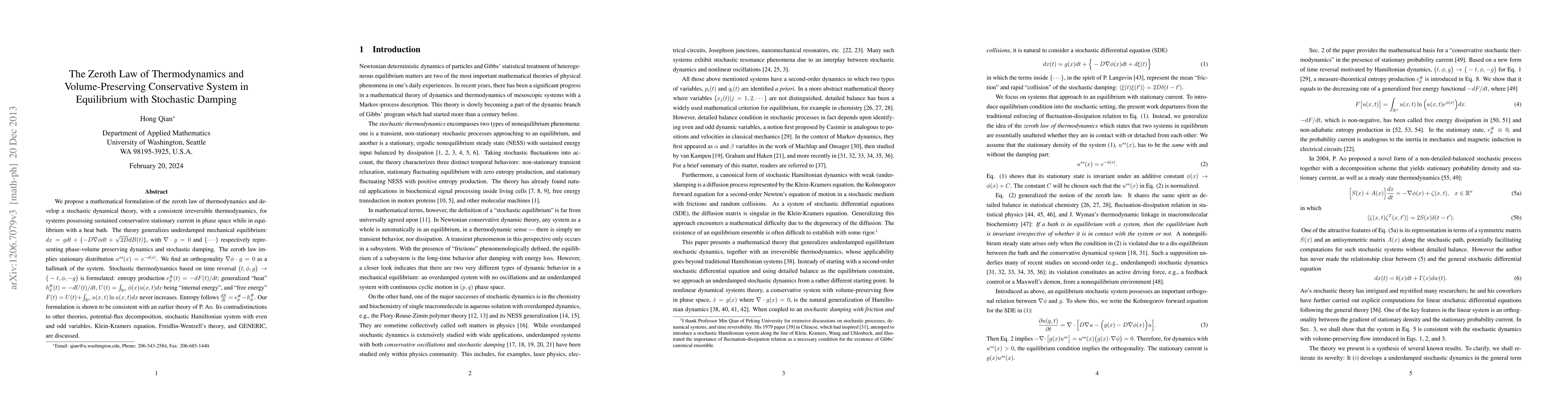 We propose a mathematical formulation of the zeroth law of thermodynamics and develop a stochastic dynamical theory, with a consistent irreversible thermodynamics, for systems possessing sustained conservative stationary current in phase space while in equilibrium with a heat bath. The theory generalizes underdamped mechanical equilibrium: $dx=gdt+\{-D\nabla\phi dt+\sqrt{2D}dB(t)\}$, with $\nabla\cdot g=0$ and $\{\cdots\}$ respectively representing phase-volume preserving dynamics and stochastic damping. The zeroth law implies stationary distribution $u^{ss}(x)=e^{-\phi(x)}$. We find an orthogonality $\nabla\phi\cdot g=0$ as a hallmark of the system. Stochastic thermodynamics based on time reversal $\big(t,\phi,g\big)\rightarrow\big(-t,\phi,-g\big)$ is formulated: entropy production $e_p^{\#}(t)=-dF(t)/dt$; generalized "heat" $h_d^{\#}(t)=-dU(t)/dt$, $U(t)=\int_{\mathbb{R}^n} \phi(x)u(x,t)dx$ being "internal energy", and "free energy" $F(t)=U(t)+\int_{\mathbb{R}^n} u(x,t)\ln u(x,t)dx$ never increases. Entropy follows $\frac{dS}{dt}=e_p^{\#}-h_d^{\#}$. Our formulation is shown to be consistent with an earlier theory of P. Ao. Its contradistinctions to other theories, potential-flux decomposition, stochastic Hamiltonian system with even and odd variables, Klein-Kramers equation, Freidlin-Wentzell's theory, and GENERIC, are discussed.