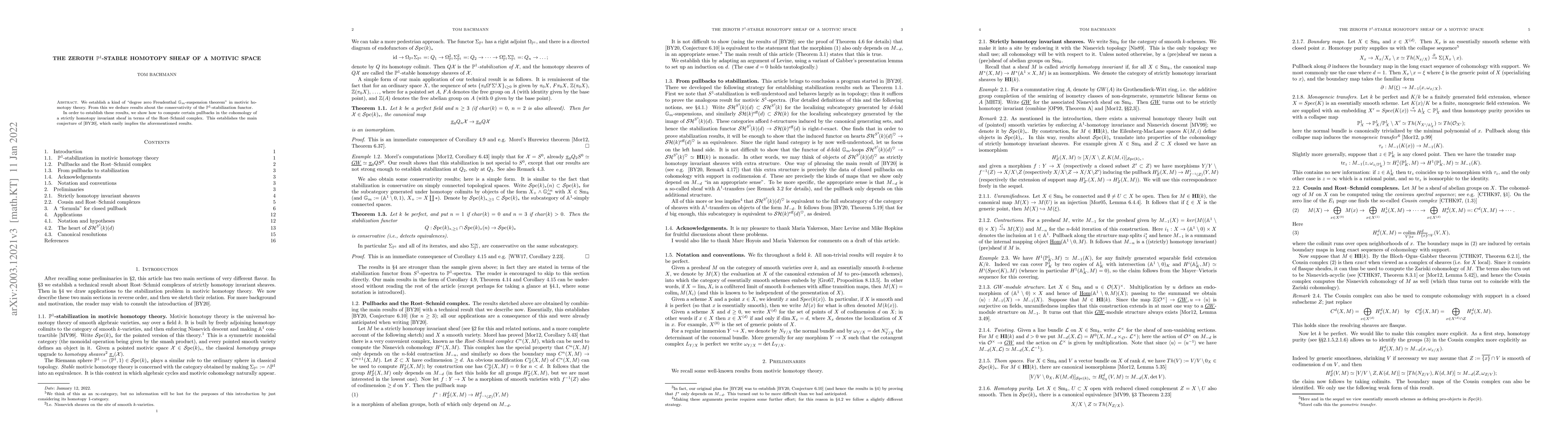 We establish a kind of "degree zero Freudenthal Gm-suspension theorem" in motivic homotopy theory. From this we deduce results about the conservativity of the P^1-stabilization functor. In order to establish these results, we show how to compute certain pullbacks in the cohomology of a strictly homotopy invariant sheaf in terms of the Rost--Schmid complex. This establishes the main conjecture of [BY18], which easily implies the aforementioned results.