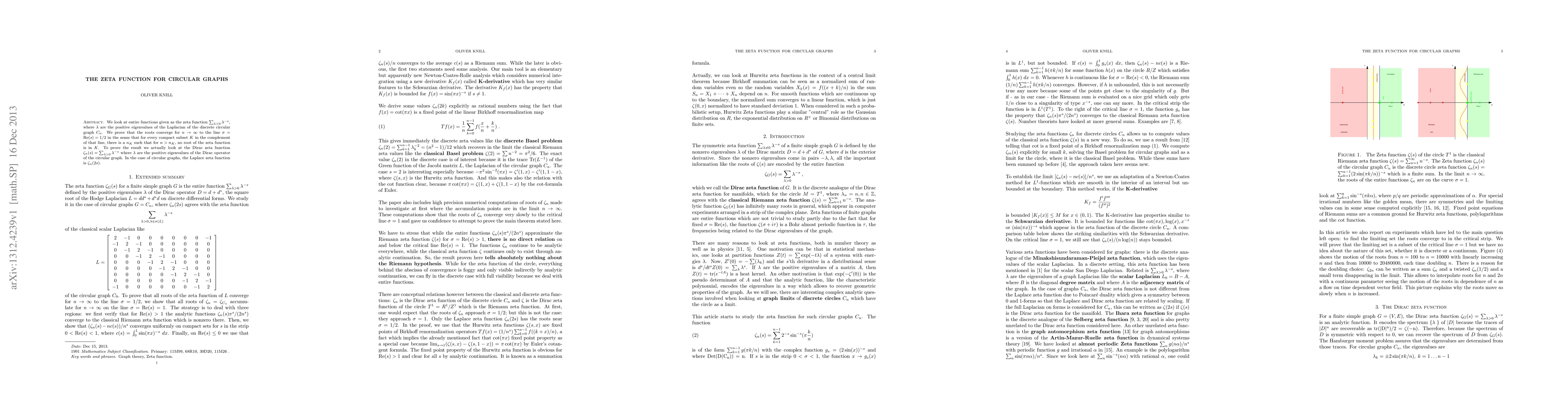 We study the entire function zeta(n,s) which is the sum of l to the power -s, where l runs over the positive eigenvalues of the Laplacian of the circular graph C(n) with n vertices. We prove that the roots of zeta(n,s) converge for n to infinity to the line Re(s)=1/2 in the sense that for every compact subset K in the complement of this line, and large enough n, no root of the zeta function zeta(n,s) is in K. To prove this, we look at the Dirac zeta function, which uses the positive eigenvalues of the Dirac operator D=d+d^* of the circular graph, the square root of the Laplacian. We extend a Newton-Coates-Rolle type analysis for Riemann sums and use a derivative which has similarities with the Schwarzian derivative. As the zeta functions zeta(n,s) of the circular graphs are entire functions, the result does not say anything about the roots of the classical Riemann zeta function zeta(s), which is also the Dirac zeta function for the circle. Only for Re(s)>1, the values of zeta(n,s) converge suitably scaled to zeta(s). We also give a new solution to the discrete Basel problem which is giving expressions like zeta_n(2) = (n^2-1)/12 or zeta_n(4) = (n^2-1)(n^2+11)/45 which allows to re-derive the values of the classical Basel problem zeta(2) = pi^2/6 or zeta(4)=pi^4/90 in the continuum limit.