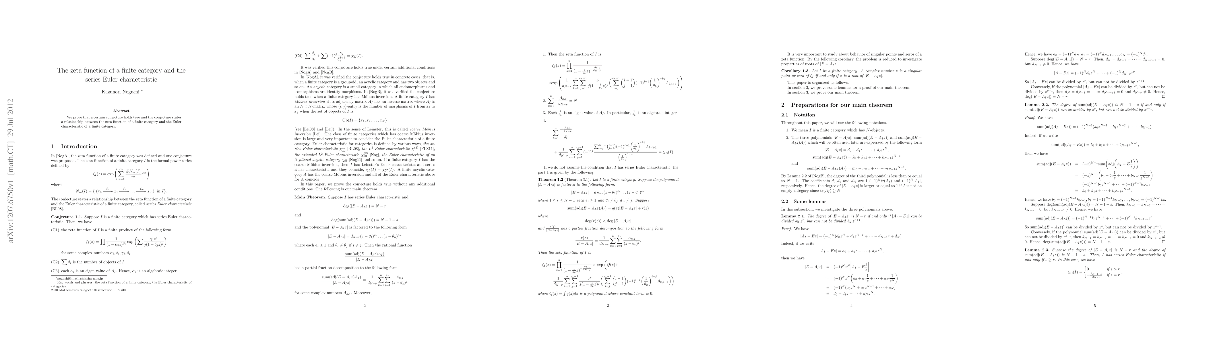 Summary: The paper proves a conjecture linking the zeta function of a finite category to its Euler characteristic, establishing a significant relationship in category theory.