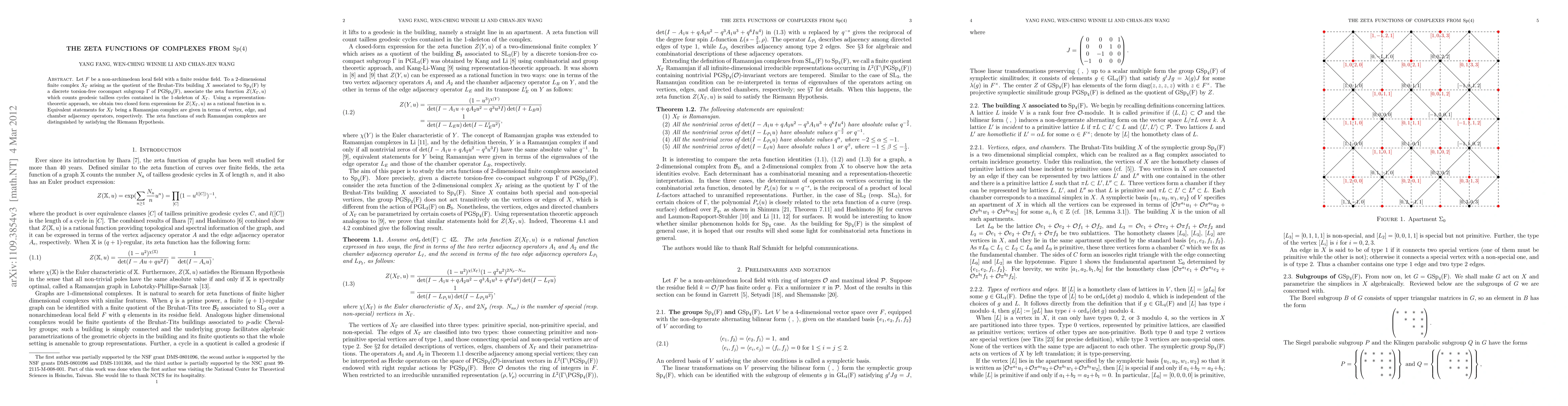 Let $F$ be a non-archimedean local field with a finite residue field. To a 2-dimensional finite complex $X_\Gamma$ arising as the quotient of the Bruhat-Tits building $X$ associated to $\Sp_4(F)$ by a discrete torsion-free cocompact subgroup $\Gamma$ of $\PGSp_4(F)$, associate the zeta function $Z(X_{\Gamma}, u)$ which counts geodesic tailless cycles contained in the 1-skeleton of $X_{\Gamma}$. Using a representation-theoretic approach, we obtain two closed form expressions for $Z(X_{\Gamma}, u)$ as a rational function in $u$. Equivalent statements for $X_{\Gamma}$ being a Ramanujan complex are given in terms of vertex, edge, and chamber adjacency operators, respectively. The zeta functions of such Ramanujan complexes are distinguished by satisfying the Riemann Hypothesis.