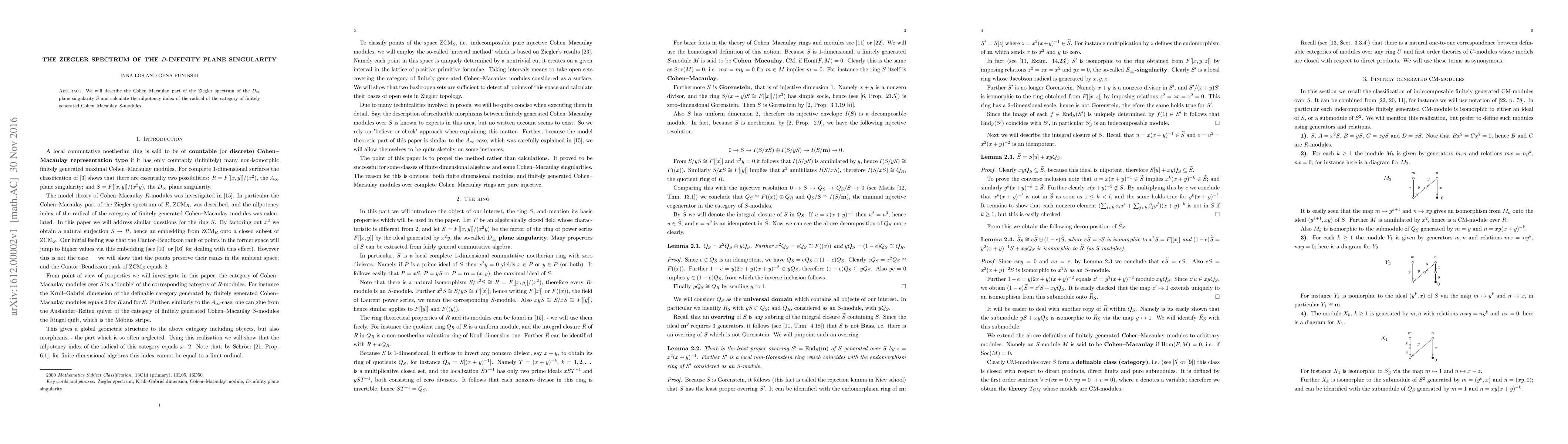 We will describe the Cohen--Macaulay part of the Ziegler spectrum of the D-infinity plane singularity S and calculate the nilpotency index of the radical of the category of finitely generated Cohen--Macaulay S-modules.