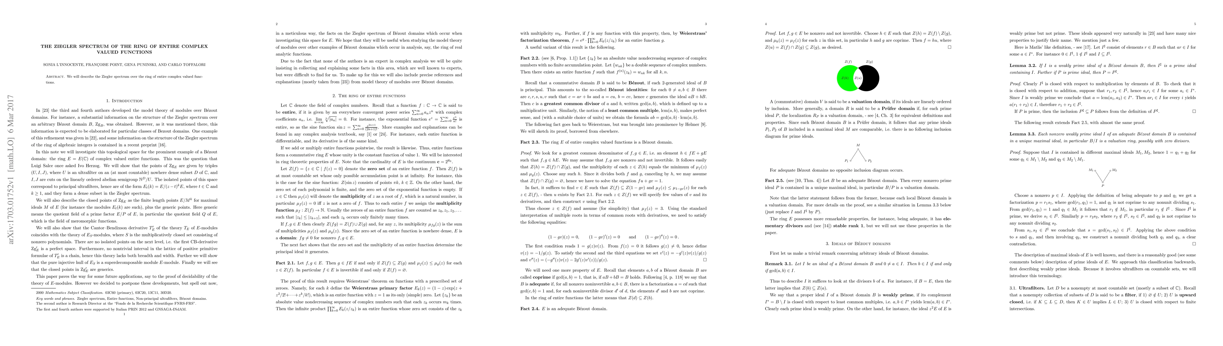 We will describe the Ziegler spectrum of the ring of entire complex valued functions
