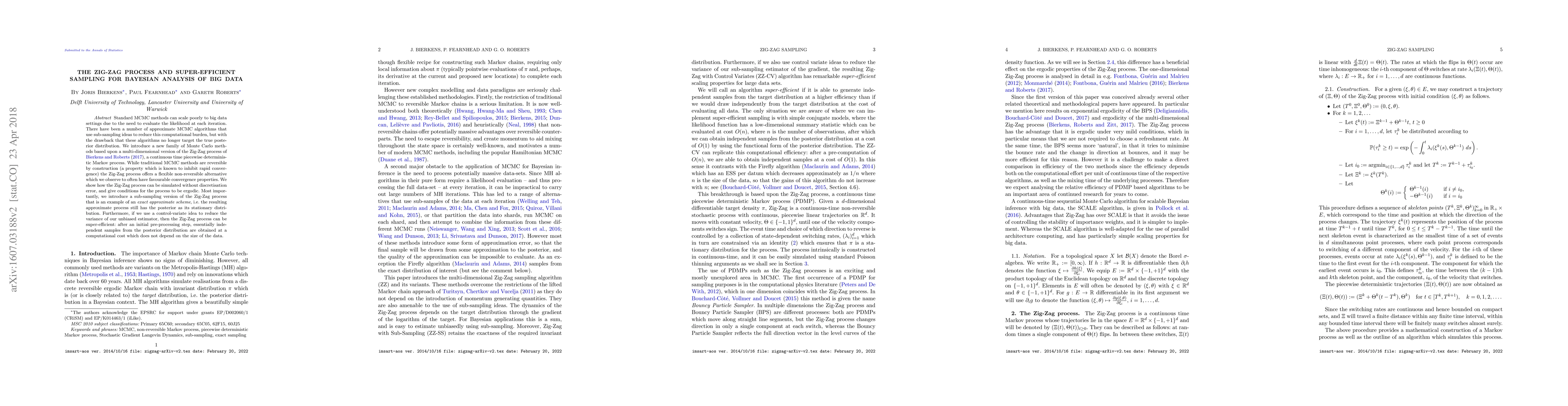 This paper introduces a novel family of Monte Carlo methods based on a multi-dimensional Zig-Zag process, offering a non-reversible alternative to traditional MCMC methods with better convergence properties. It presents an exact approximate scheme that maintains the true posterior distribution, and when combined with a control-variate method, achieves super-efficient sampling for Bayesian analysis of big data with constant computational cost.