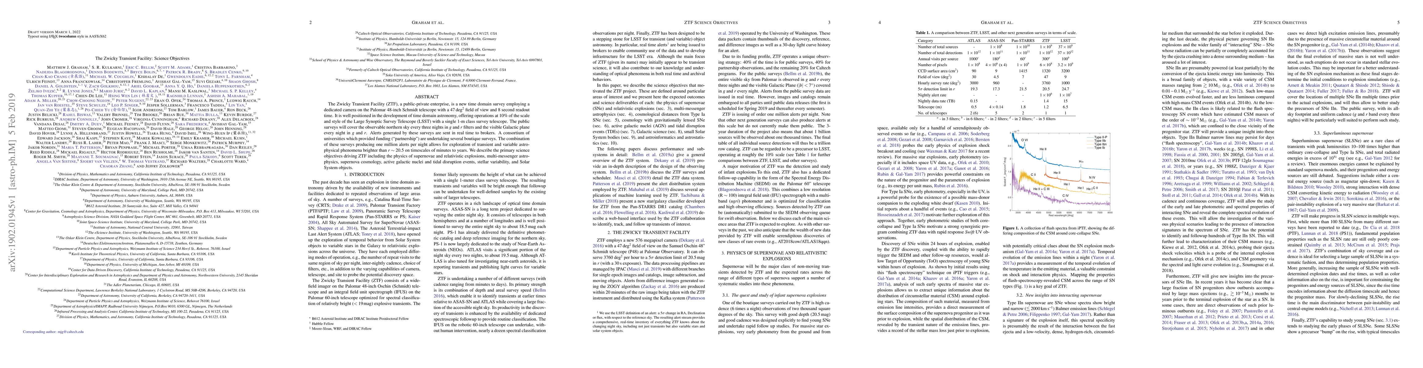The Zwicky Transient Facility (ZTF) is a time domain survey using a dedicated camera on the Palomar telescope, aiming to explore transient and variable astrophysical phenomena with one million alerts per night. Its primary science objectives include supernovae, relativistic explosions, multi-messenger astrophysics, and stellar variability.
