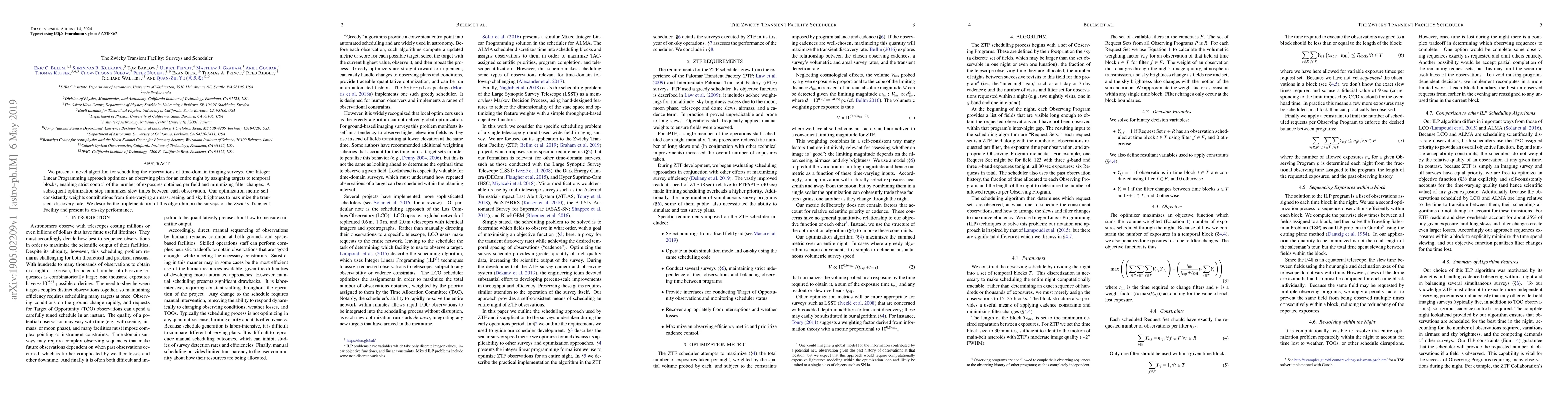 The Zwicky Transient Facility employs an Integer Linear Programming algorithm to optimize nightly observation schedules, maximizing transient discovery rates by balancing airmass, seeing, and sky brightness conditions. The algorithm minimizes filter changes and slew times, demonstrating effective on-sky performance.
