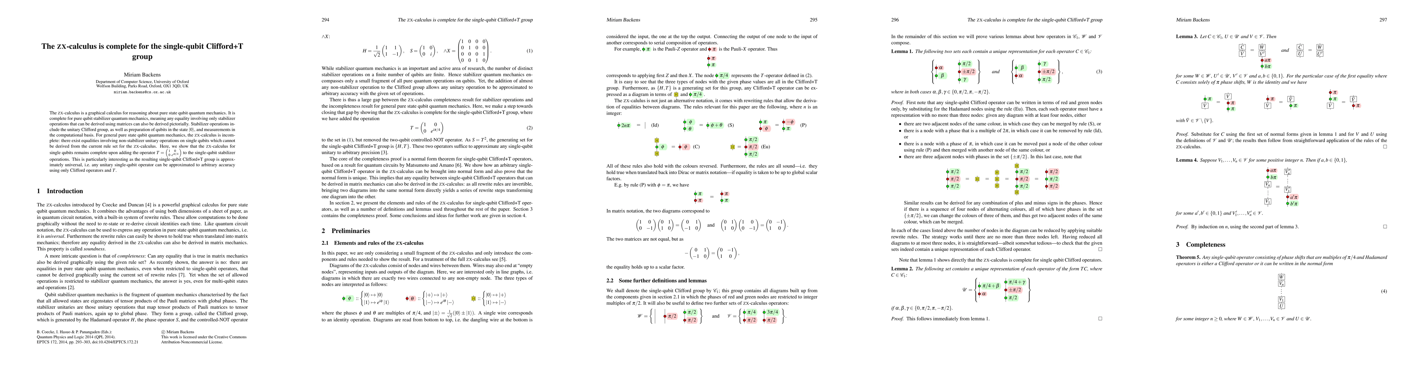 The ZX-calculus is complete for the single-qubit Clifford+T group, as adding the operator T to the stabilizer operations maintains completeness for deriving equalities involving Clifford and T operations. This extension is significant because the Clifford+T group is nearly universal for approximating any single-qubit unitary operation.