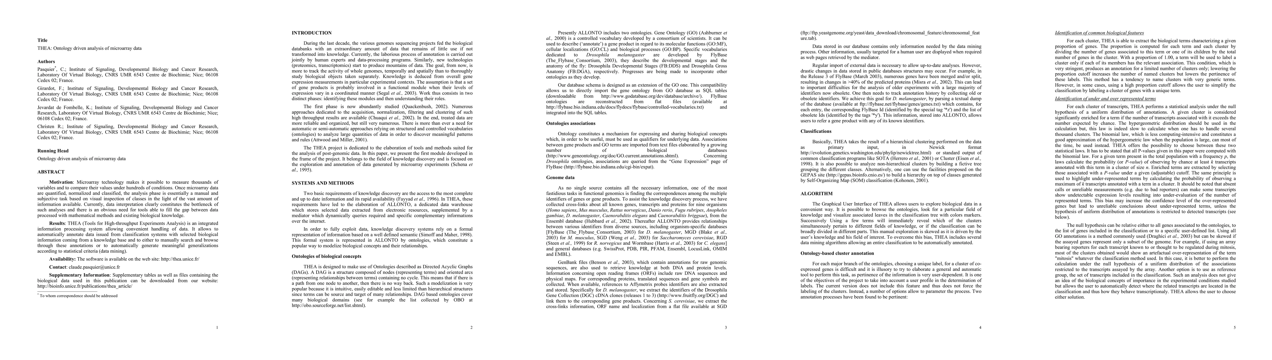 **Summary:** THEA is an integrated system for analyzing microarray data by linking processed data with biological knowledge from a knowledge base, facilitating both manual and automated data interpretation to overcome the bottleneck of manual analysis. The software is freely accessible online.