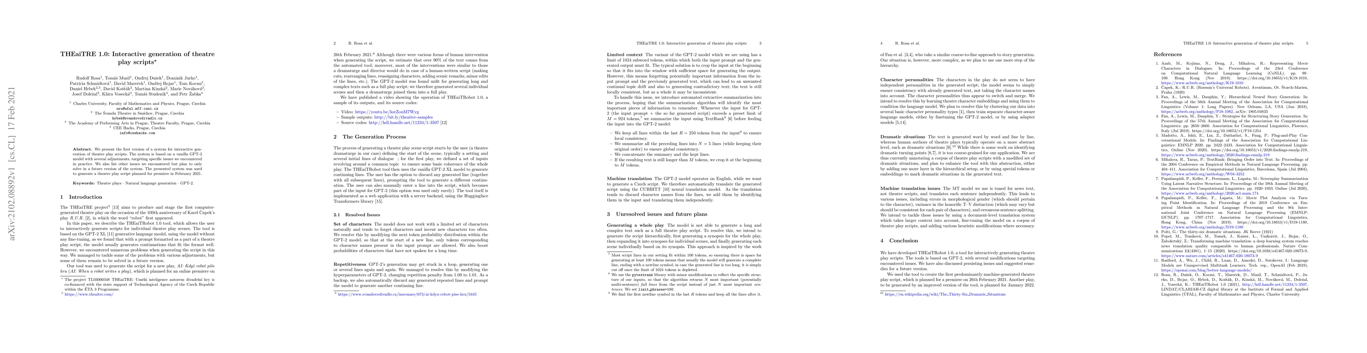 The paper introduces THEaiTRE 1.0, an interactive system for generating theatre play scripts using a modified GPT-2 model, which successfully produced a script set for premiere in February 2021, with plans for future enhancements to address additional issues.