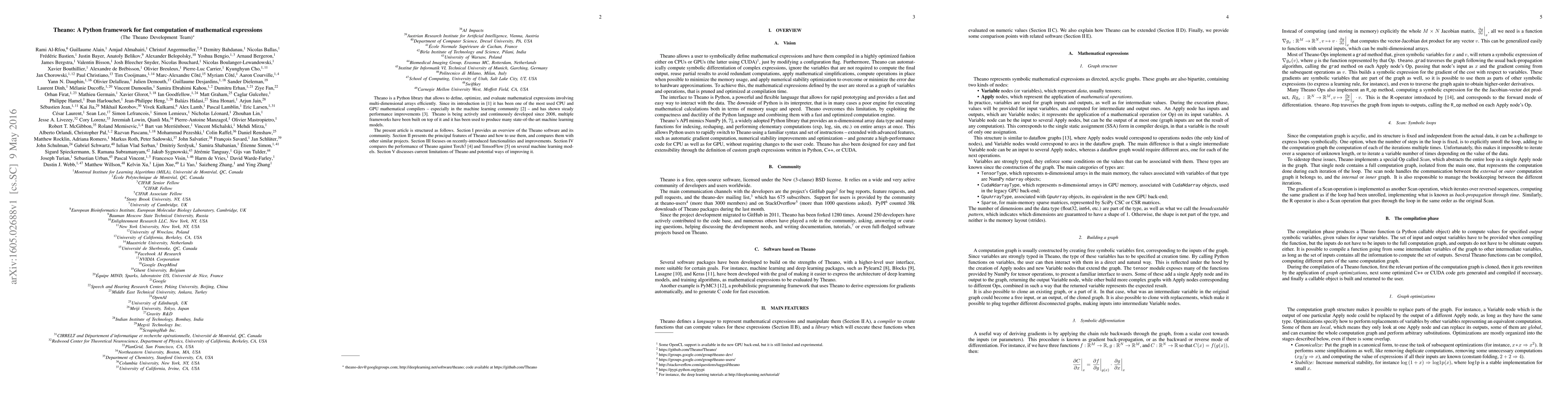 Theano is a Python library for efficient computation of mathematical expressions, particularly used in machine learning. It has been continuously developed since 2008, and its performance has been benchmarked against other frameworks like Torch7 and TensorFlow.