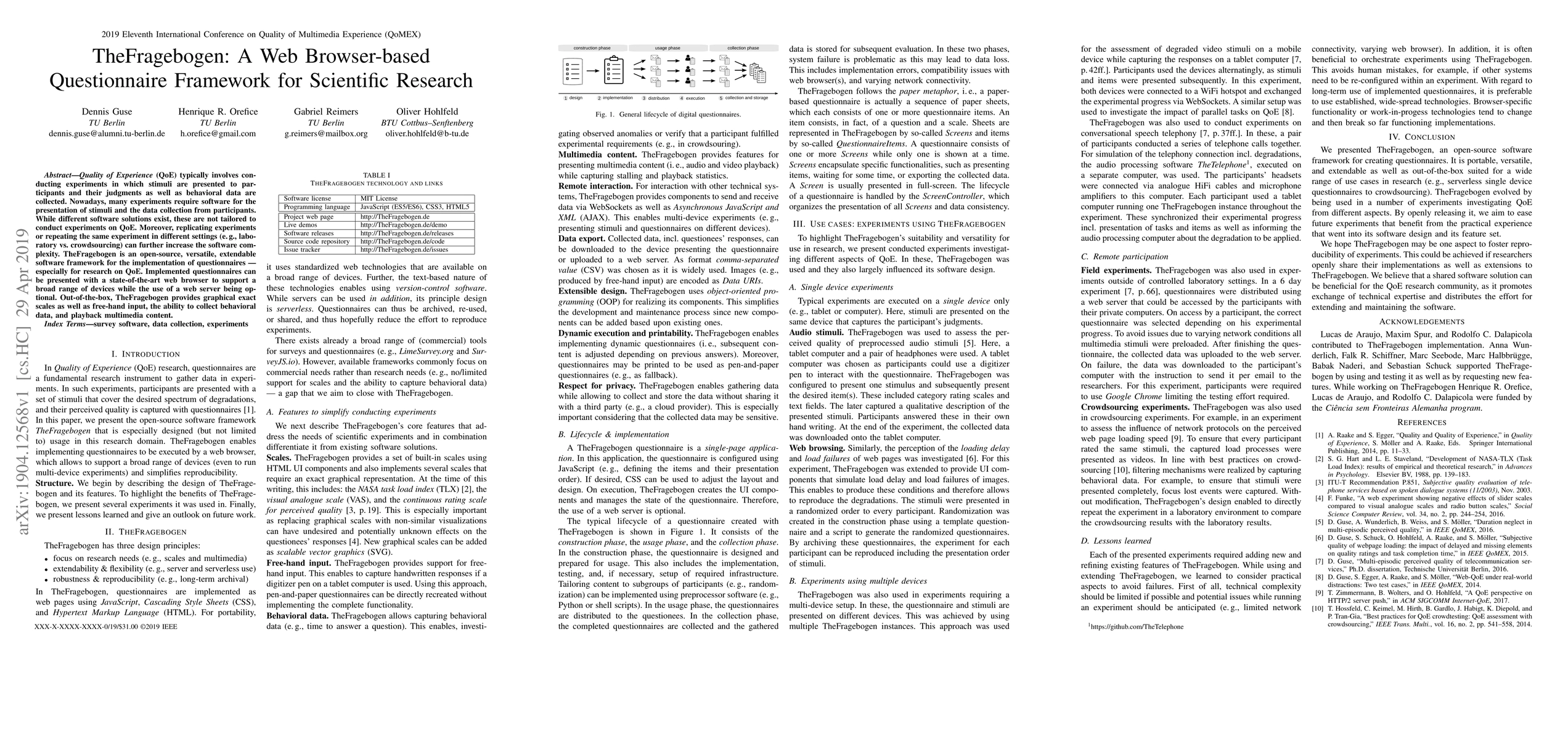TheFragebogen is an open-source framework for creating web-based questionnaires tailored for Quality of Experience research, enabling diverse data collection across various devices. It offers features like graphical scales, free-hand input, and multimedia playback, simplifying experiment replication across different settings.
