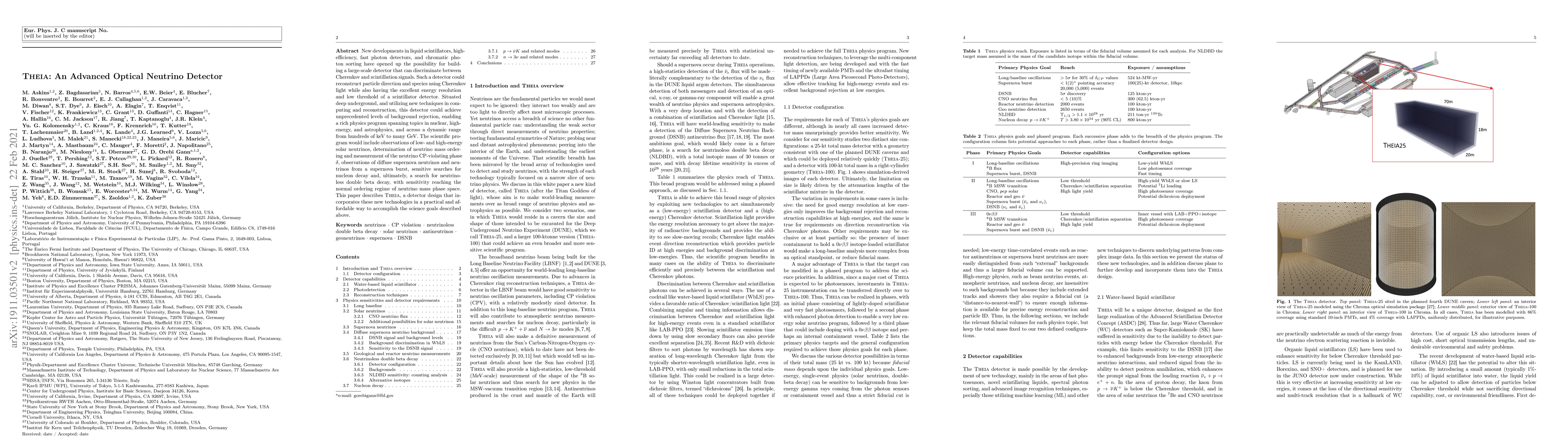 New developments in liquid scintillators, high-efficiency, fast photon detectors, and chromatic photon sorting have opened up the possibility for building a large-scale detector that can discriminate between Cherenkov and scintillation signals. Such a detector could exploit these two distinct signals to observe particle direction and species using Cherenkov light while also having the excellent energy resolution and low threshold of a scintillator detector. Situated in a deep underground laboratory, and utilizing new techniques in computing and reconstruction techniques, such a detector could achieve unprecedented levels of background rejection, thus enabling a rich physics program that would span topics in nuclear, high-energy, and astrophysics, and across a dynamic range from hundreds of keV to many GeV. The scientific program would include observations of low- and high-energy solar neutrinos, determination of neutrino mass ordering and measurement of the neutrino CP violating phase, observations of diffuse supernova neutrinos and neutrinos from a supernova burst, sensitive searches for nucleon decay and, ultimately, a search for NeutrinoLess Double Beta Decay (NLDBD) with sensitivity reaching the normal ordering regime of neutrino mass phase space. This paper describes Theia, a detector design that incorporates these new technologies in a practical and affordable way to accomplish the science goals described above. We consider two scenarios, one in which Theia would reside in a cavern the size and shape of the caverns intended to be excavated for the Deep Underground Neutrino Experiment (DUNE) which we call Theia 25, and a larger 100 ktonne version (Theia 100) that could achieve an even broader and more sensitive scientific program.