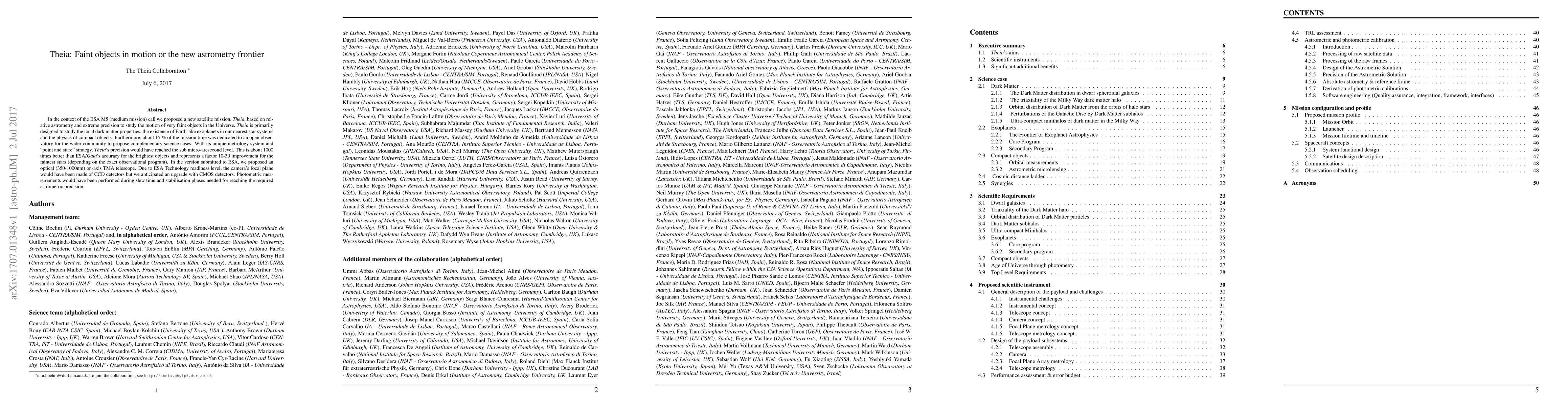 Theia is a proposed satellite mission aimed at studying faint objects in the Universe using extreme precision astrometry, focusing on local dark matter properties, Earth-like exoplanets, and compact objects. It would achieve sub-micro-arcsecond accuracy, significantly outperforming current instruments like ESA/Gaia.