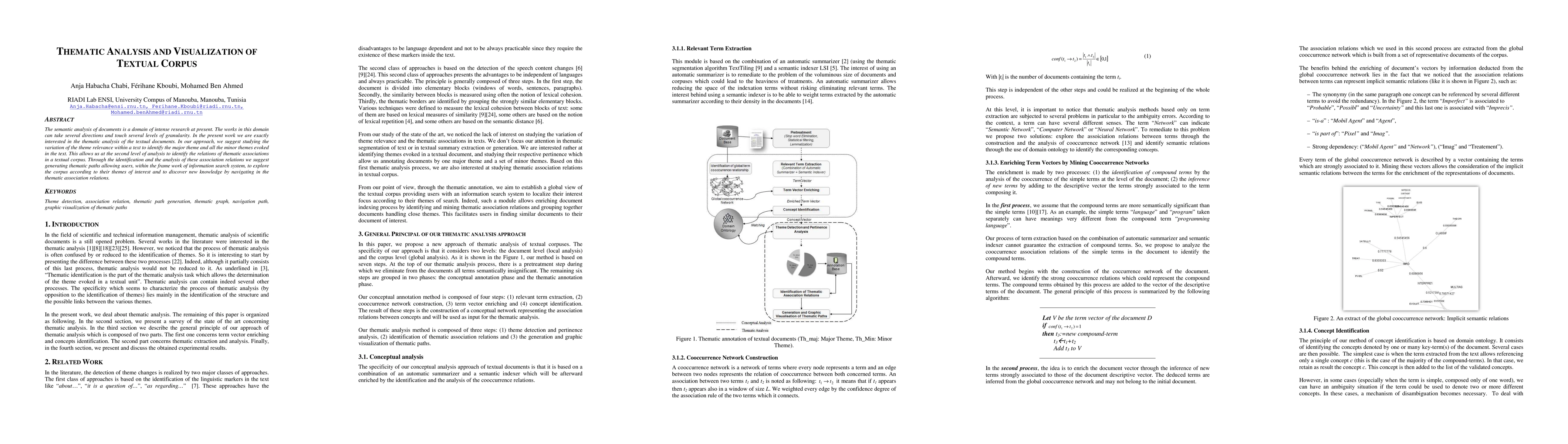 This paper proposes a method for thematic analysis and visualization of textual documents, focusing on identifying major and minor themes and their associations. The approach generates thematic paths to facilitate information search and discovery within a textual corpus.