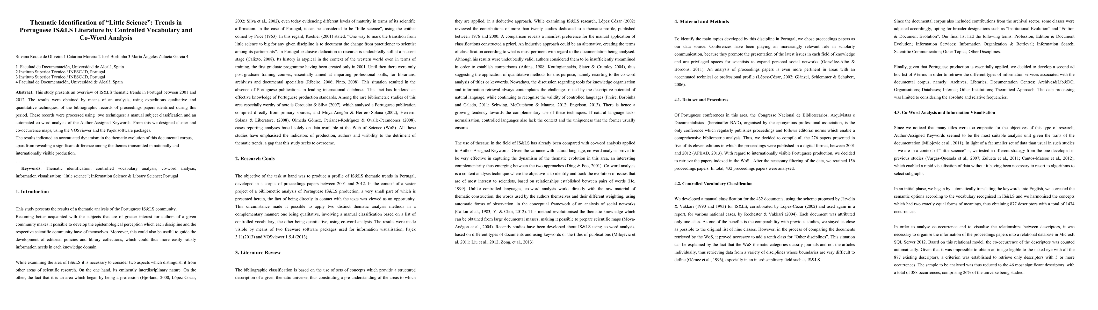 This study presents an overview of IS&LS thematic trends in Portugal between 2001 and 2012. The results were obtained by means of an analysis, using expeditious qualitative and quantitative techniques, of the bibliographic records of proceedings papers identified during this period. These records were processed using two techniques: a manual subject classification and an automated co-word analysis of the Author-Assigned Keywords. From this we designed cluster and co-occurrence maps, using the VOSviewer and the Pajek software packages. The results indicated an accentuated dynamism in the thematic evolution of this documental corpus, apart from revealing a significant difference among the themes transmitted in nationally and internationally visible production.