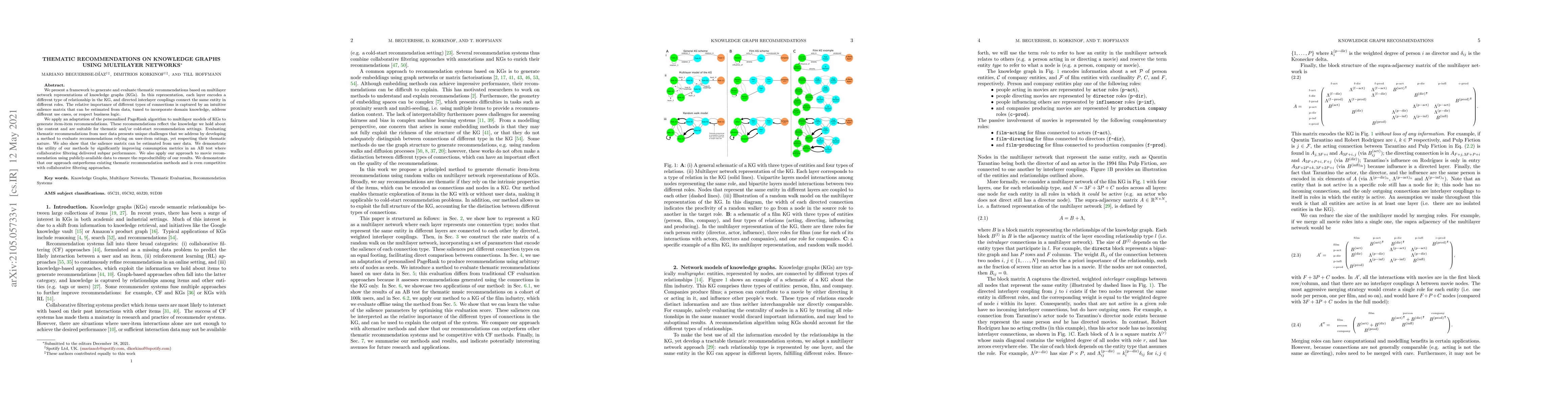 We present a framework to generate and evaluate thematic recommendations based on multilayer network representations of knowledge graphs (KGs). In this representation, each layer encodes a different type of relationship in the KG, and directed interlayer couplings connect the same entity in different roles. The relative importance of different types of connections is captured by an intuitive salience matrix that can be estimated from data, tuned to incorporate domain knowledge, address different use cases, or respect business logic. We apply an adaptation of the personalised PageRank algorithm to multilayer models of KGs to generate item-item recommendations. These recommendations reflect the knowledge we hold about the content and are suitable for thematic and/or cold-start recommendation settings. Evaluating thematic recommendations from user data presents unique challenges that we address by developing a method to evaluate recommendations relying on user-item ratings, yet respecting their thematic nature. We also show that the salience matrix can be estimated from user data. We demonstrate the utility of our methods by significantly improving consumption metrics in an AB test where collaborative filtering delivered subpar performance. We also apply our approach to movie recommendation using publicly-available data to ensure the reproducibility of our results. We demonstrate that our approach outperforms existing thematic recommendation methods and is even competitive with collaborative filtering approaches.