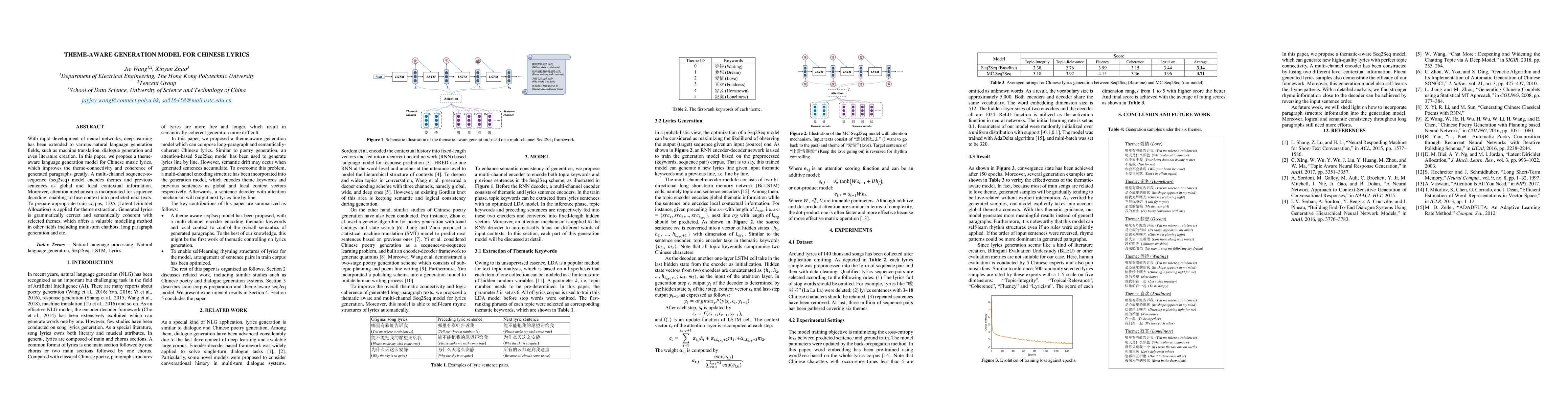 This paper proposes a theme-aware language generation model for Chinese lyrics using a multi-channel seq2seq model with attention mechanism, enhancing theme connectivity and coherence. LDA is used for theme extraction, resulting in grammatically correct and semantically coherent generated lyrics.