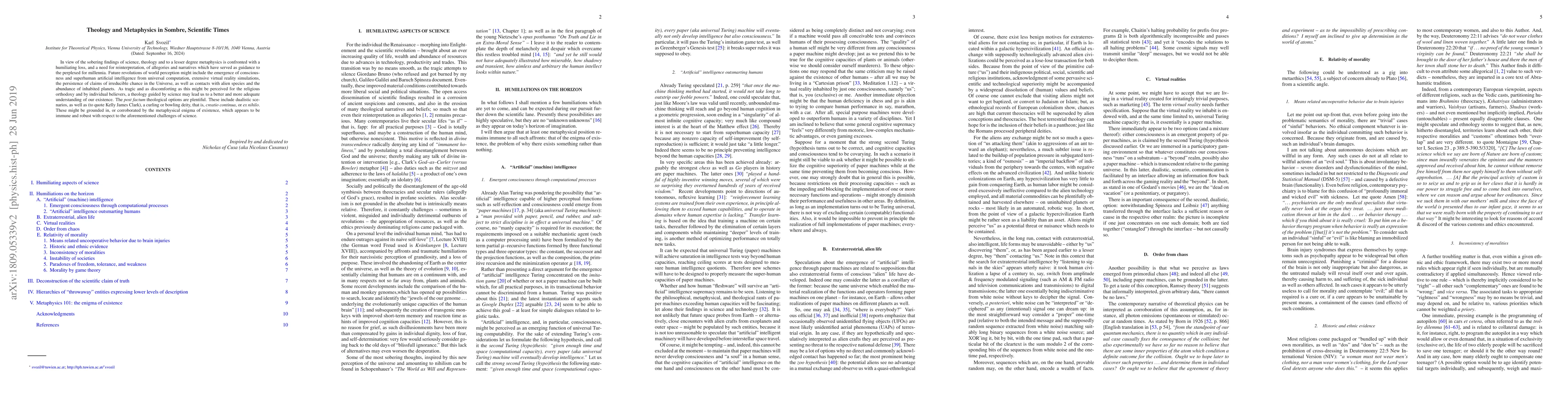 In view of the sobering findings of science, theology and to a lesser degree metaphysics is confronted with a humiliating loss, and a need for reinterpretation, of allegories and narratives which have served as guidance to the perplexed for millennia. Future revolutions of world perception might include the emergence of consciousness and superhuman artificial intelligence from universal computation, extensive virtual reality simulations, the persistence of claims of irreducible chance in the Universe, as well as contacts with alien species and the abundance of inhabited planets. As tragic and as discomforting as this might be perceived for the religious orthodoxy and by individual believers, a theology guided by science may lead us to a better and more adequate understanding of our existence. The post factum theological options are plentiful. These include dualistic scenarios, as well as (to quote Kelly James Clark), a curling or bowling deity, that is, creatio continua, or ex nihilo. These might be grounded in, or corroborated by the metaphysical enigma of existence, which appears to be immune and robust with respect to the aforementioned challenges of science.