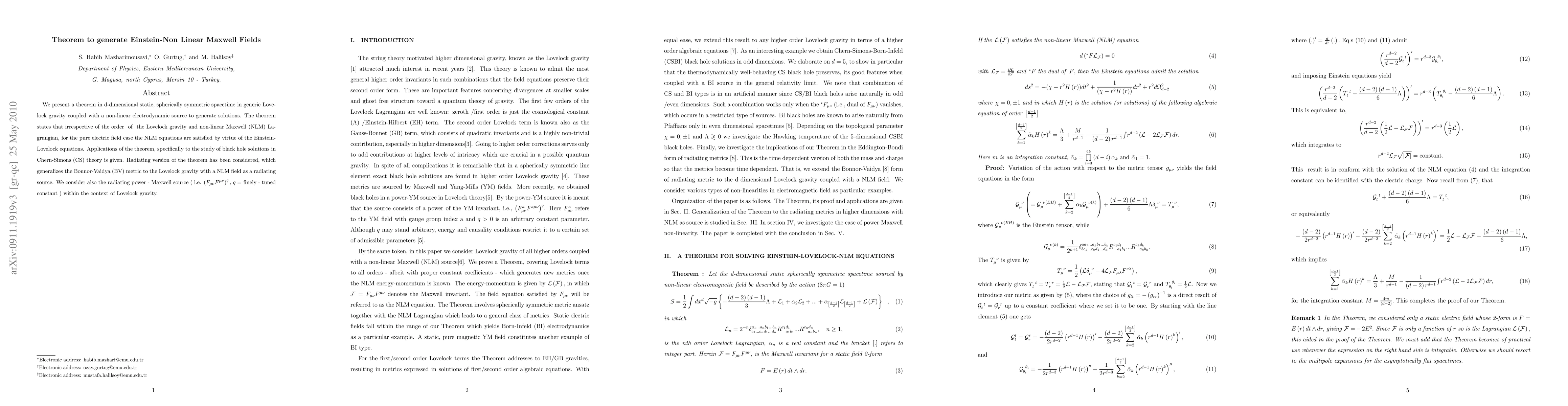 We present a theorem in d-dimensional static, spherically symmetric spacetime in generic Lovelock gravity coupled with a non-linear electrodynamic source to generate solutions. The theorem states that irrespective of the order of the Lovelock gravity and non-linear Maxwell (NLM) Lagrangian, for the pure electric field case the NLM equations are satisfied by virtue of the Einstein-Lovelock equations. Applications of the theorem, specifically to the study of black hole solutions in Chern-Simons (CS) theory is given. Radiating version of the theorem has been considered, which generalizes the Bonnor-Vaidya (BV) metric to the Lovelock gravity with a NLM field as a radiating source. We consider also the radiating power - Maxwell source (i.e. $\(F_{\mu \nu}F^{\mu \nu}\)^{q},$ $q=$ finely - tuned constant) within the context of Lovelock gravity.