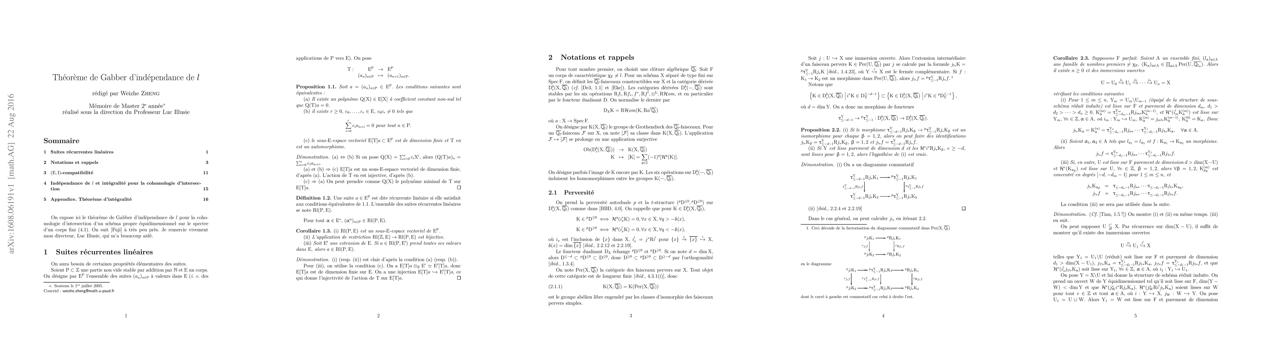 This paper presents Gabber's theorem demonstrating the independence of $l$ in the intersection cohomology of a proper equidimensional scheme over the spectrum of a finite field, closely following the approach in [Fuji]. The result underscores the independence of $l$ in this cohomology context.