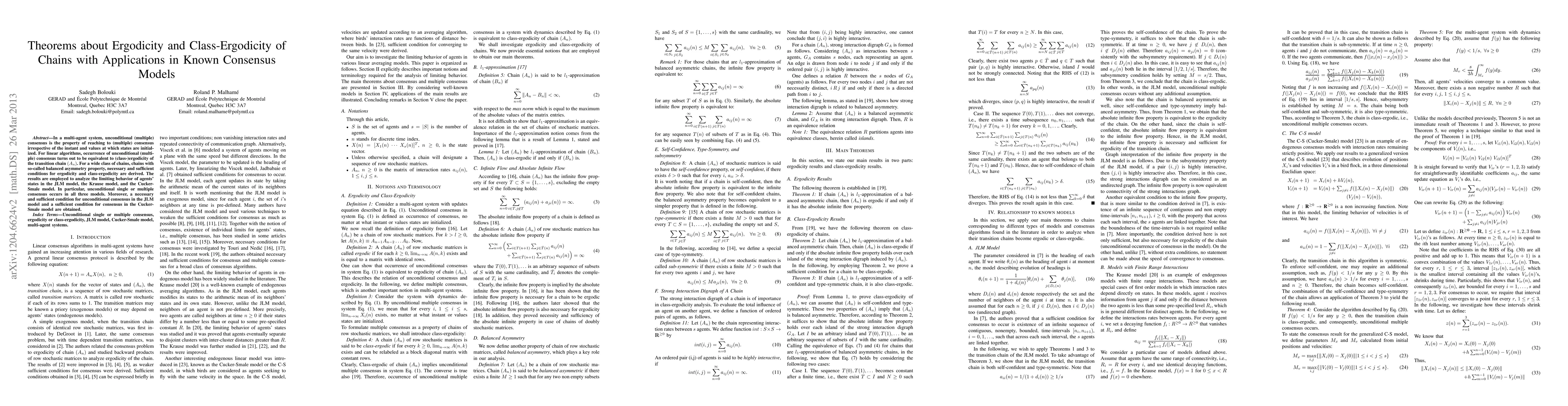 Research finds necessary and sufficient conditions for ergodicity and class-ergodicity in chains with balanced asymmetry property, leading to unconditional consensus in models like JLM, Krause, and Cucker-Smale models.
