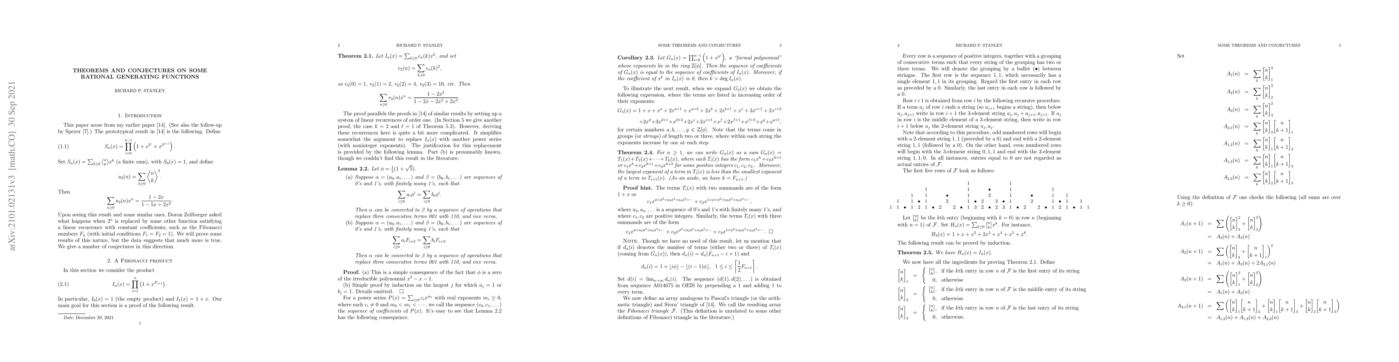 Let $I_n(x)=\prod_{i=1}^n \left( 1+x^{F_{i+1}}\right)$, where $F_{i+1}$ denotes a Fibonacci number. Let $v_r(n)$ denote the sum of the $r$th powers of the coefficients of $I_n(x)$. Our prototypical result is that $\sum_{n\geq 0} v_2(n)x^n= (1-2x^2)/(1-2x-2x^2+2x^3)$. We give many related results and conjectures. A certain infinite poset $\mathfrak{F}$ is naturally associated with $I_n(x)$. We discuss some combinatorial properties of $\mathfrak{F}$ and a natural generalization, including a symmetric function that encodes the flag $h$-vector of $\mathfrak{F}$.