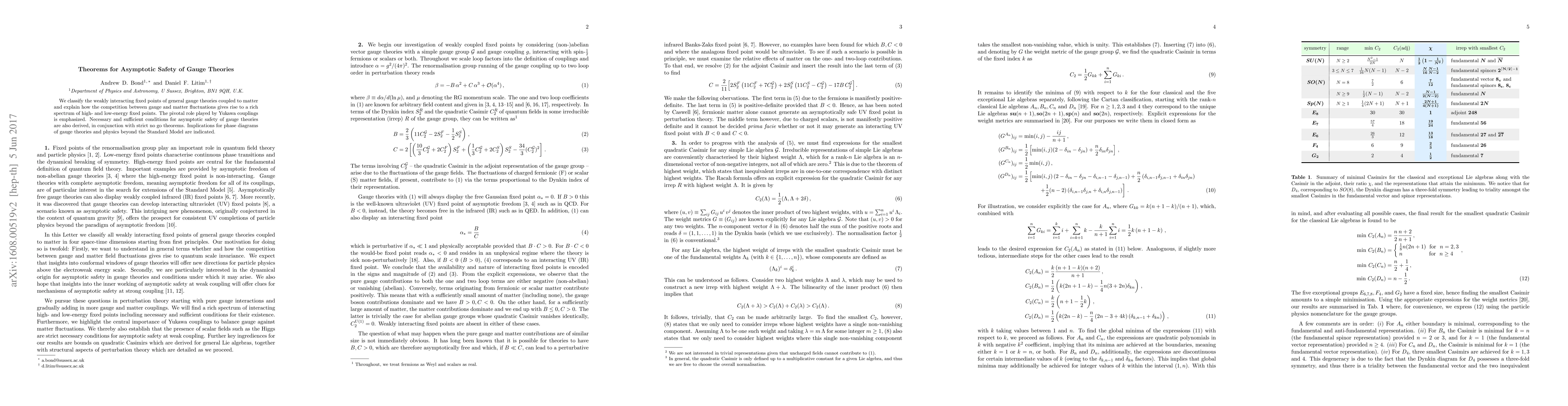 This paper explores the weakly interacting fixed points in gauge theories coupled to matter, highlighting the interplay between gauge and matter fluctuations. It derives conditions for asymptotic safety and presents no-go theorems, with implications for phase diagrams and physics beyond the Standard Model.