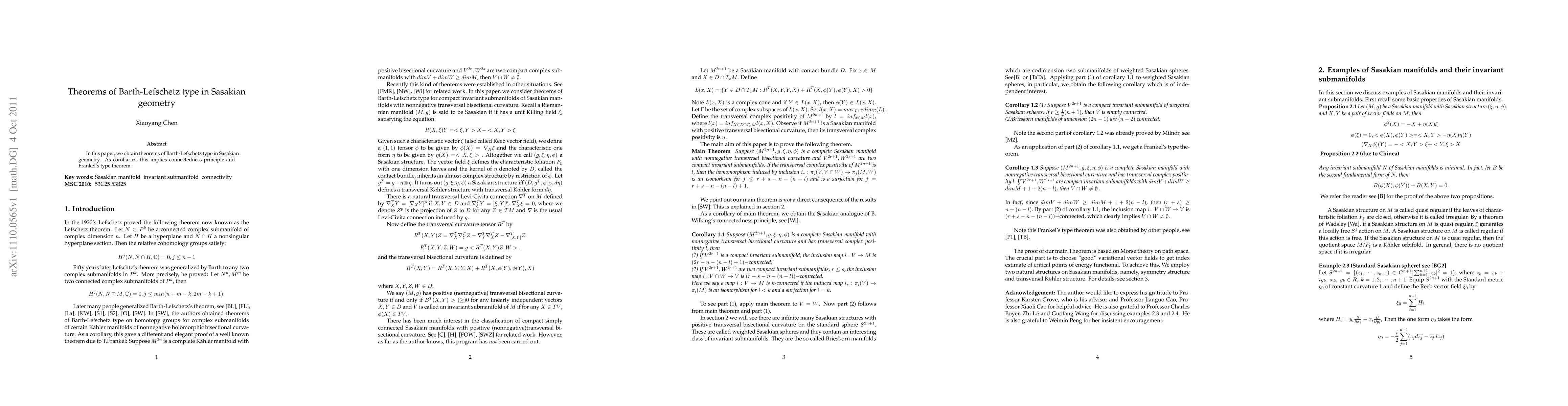This paper establishes Barth-Lefschetz type theorems in the context of Sasakian geometry, leading to implications for connectedness principles and theorems akin to Frankel's.
