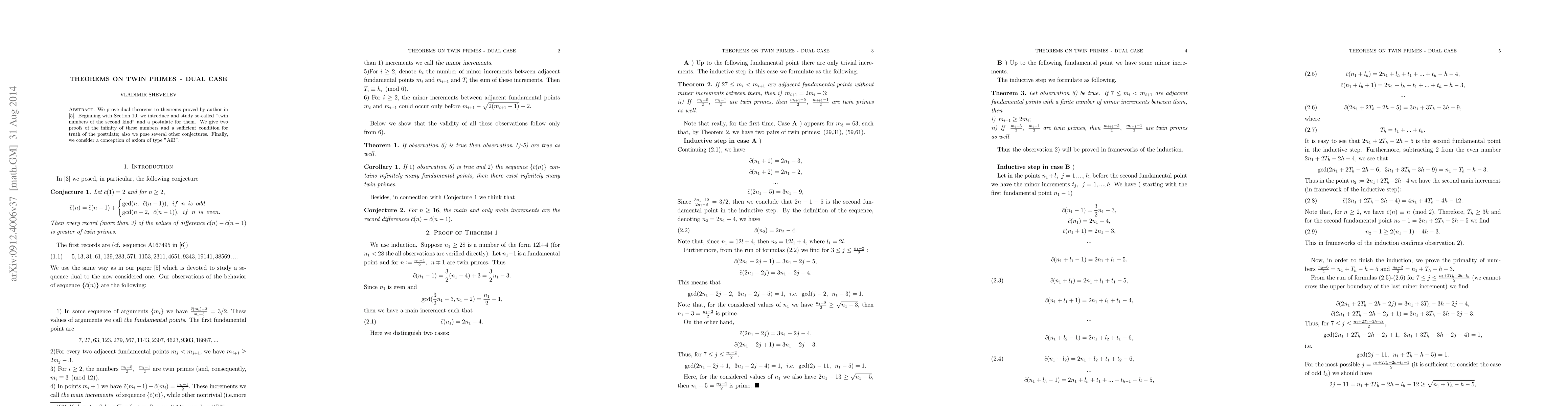 The paper proves dual theorems related to previous findings on twin primes, introducing and studying "twin numbers of the second kind" with two proofs of their infinity and a sufficient condition for a related postulate, alongside proposing additional conjectures and considering a new type of axiom.