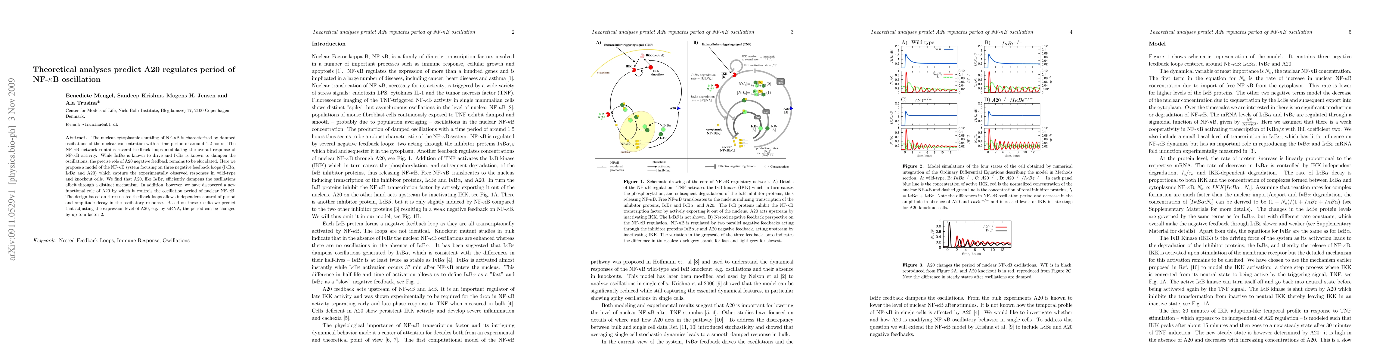 This paper proposes a theoretical model of the NF-kB system highlighting three negative feedback loops, including A20, which modulates the oscillation period of NF-kB. The study predicts that altering A20 expression can change the oscillation period by up to a factor of 2.